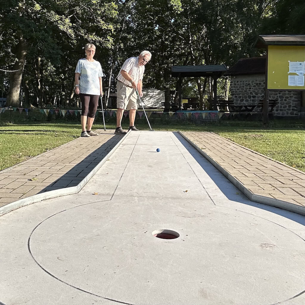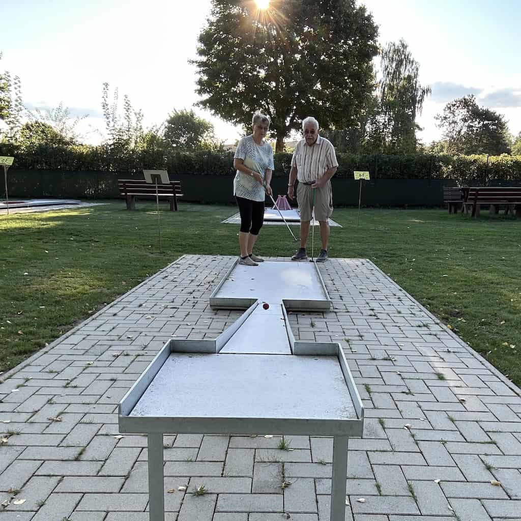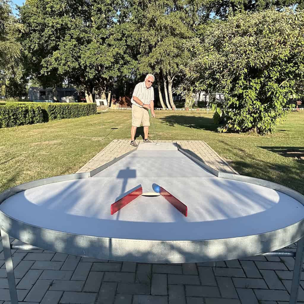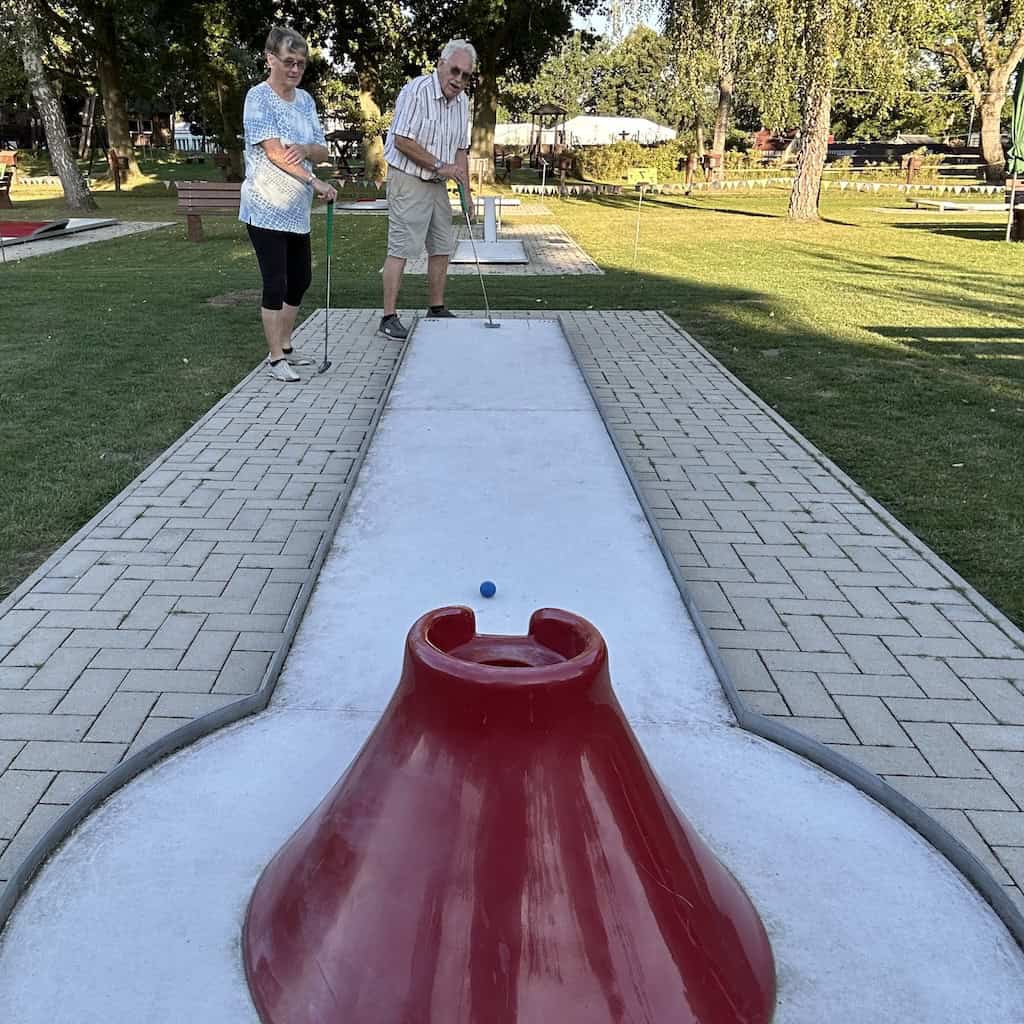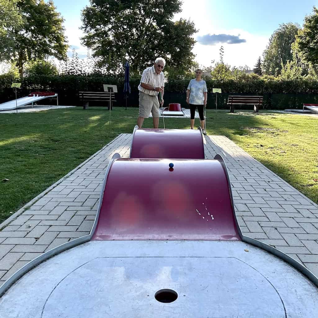 Erst bei Sonnenuntergang spielen wir eine Runde Minigolf. Wir sind dann ganz alleine im Park.