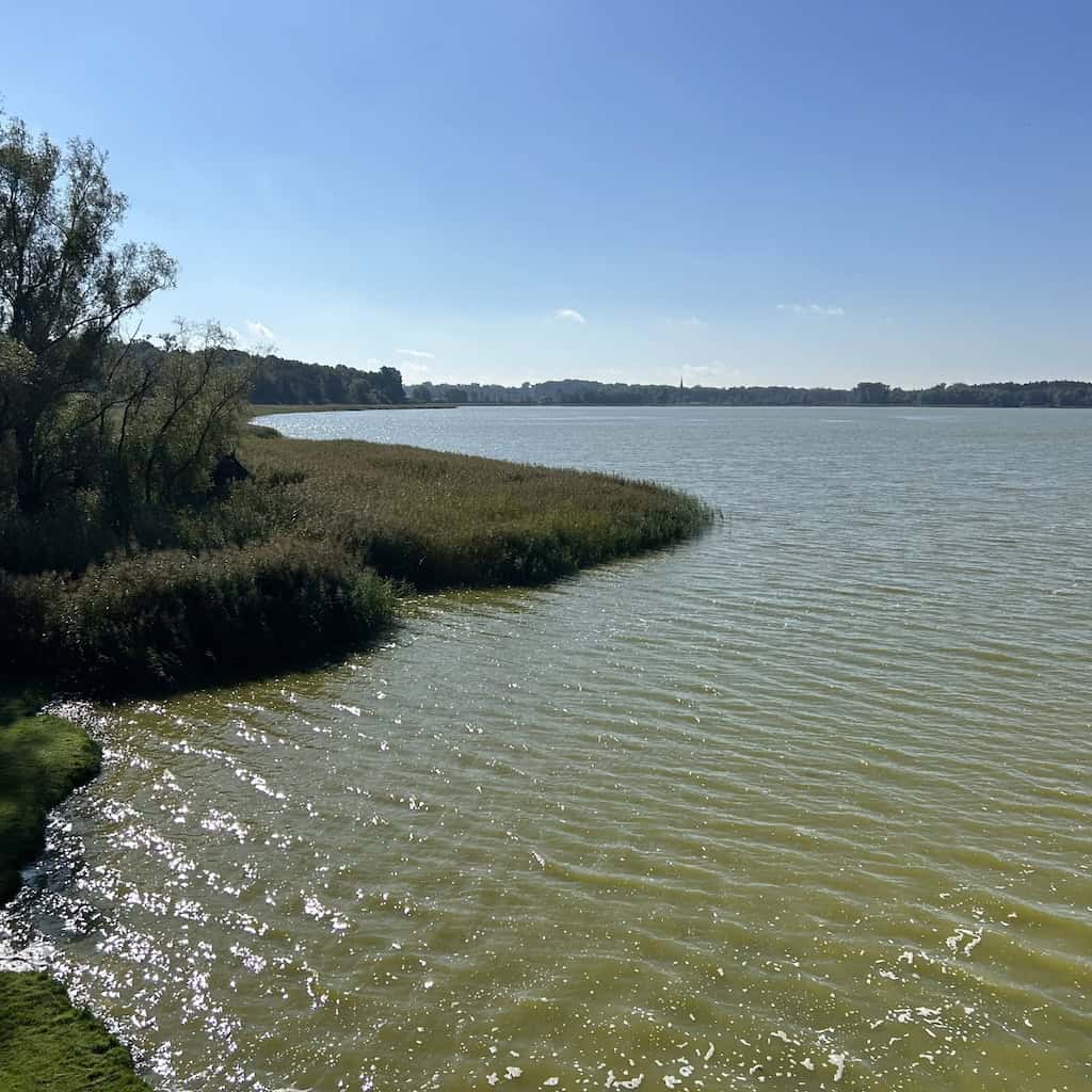 Wir steigen auf den Aussichtsturm und geniessen die Sicht über den «Großen Varchentiner See». Der Rastplatz wäre gut um länger zum Verweilen, aber wir ziehen weiter. Auch die Stare versammeln sich für den Abflug in den Süden. Unser heutiges Ziel ist Grünow, wo wir am Nachmittag bei Renate und Jürgen zu Besuch angemeldet sind.