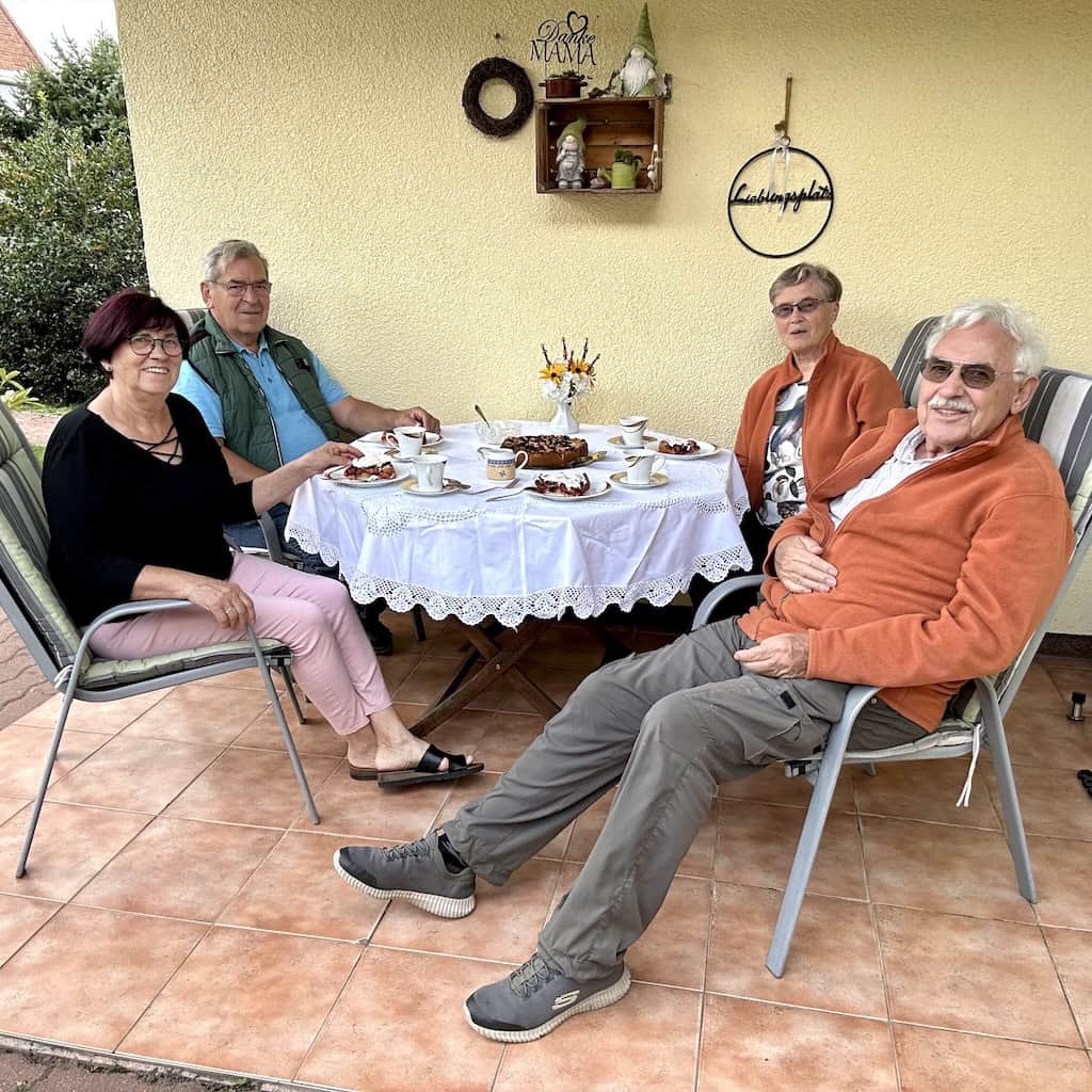 Hier verbringen wir den Nachmittag bei Kaffee und selbst gebackenem Zwetschgenkuchen. Obwohl der Kuchen ganz ausgezeichnet mundet, schaffen wir den zweiten nicht mehr. Renate und Jürgen wohnen in einem wahren Paradies.
