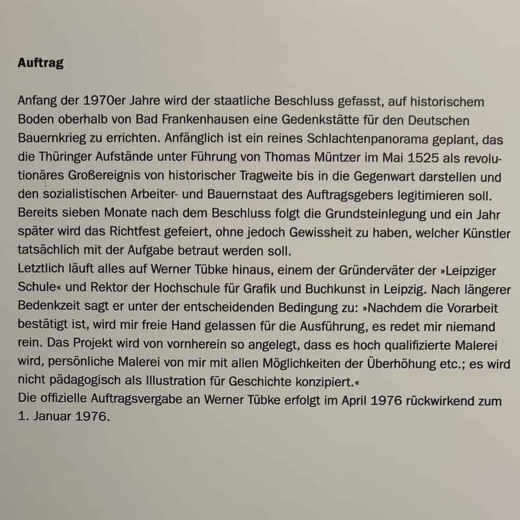 Das Monumentalgemälde ist 14 Meter hoch und hat einen Umfang von 123 Meter. Über 3000 Figuren gibt es in 75 Schlüsselszenen zu bestaunen. 11 Jahre haben der Künstler Werner Tübke und 15 Maler an der Fertigstellung gearbeitet. Im Oktober 1987 beendete Tübke dies offiziell mit seiner Signatur. Kurz vor dem Ende der DDR wurde das Museum im Oktober 1989 eröffnet.