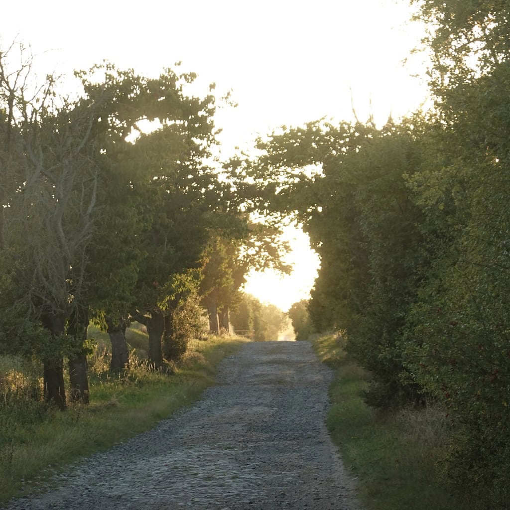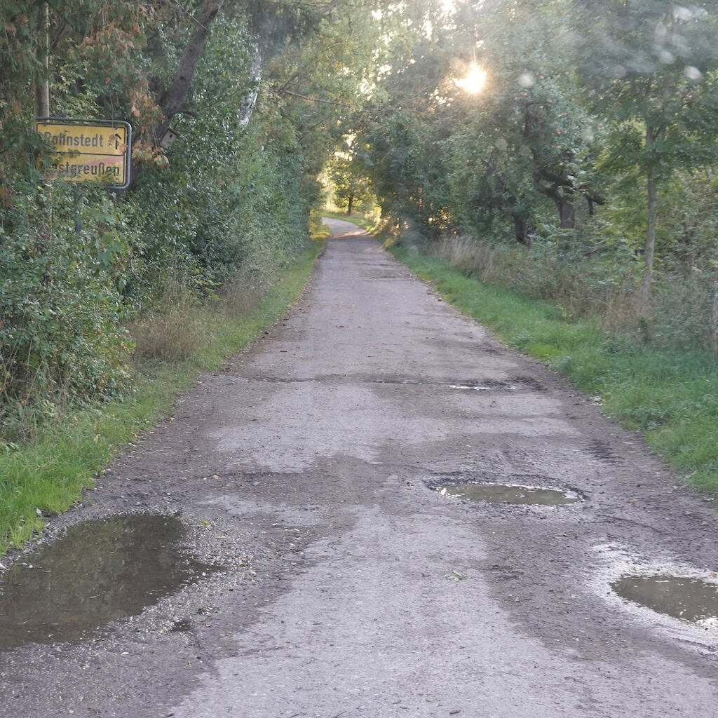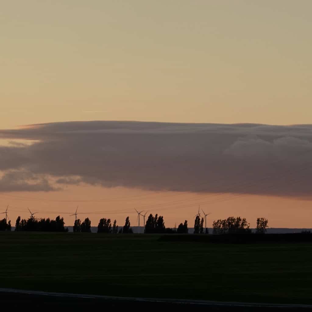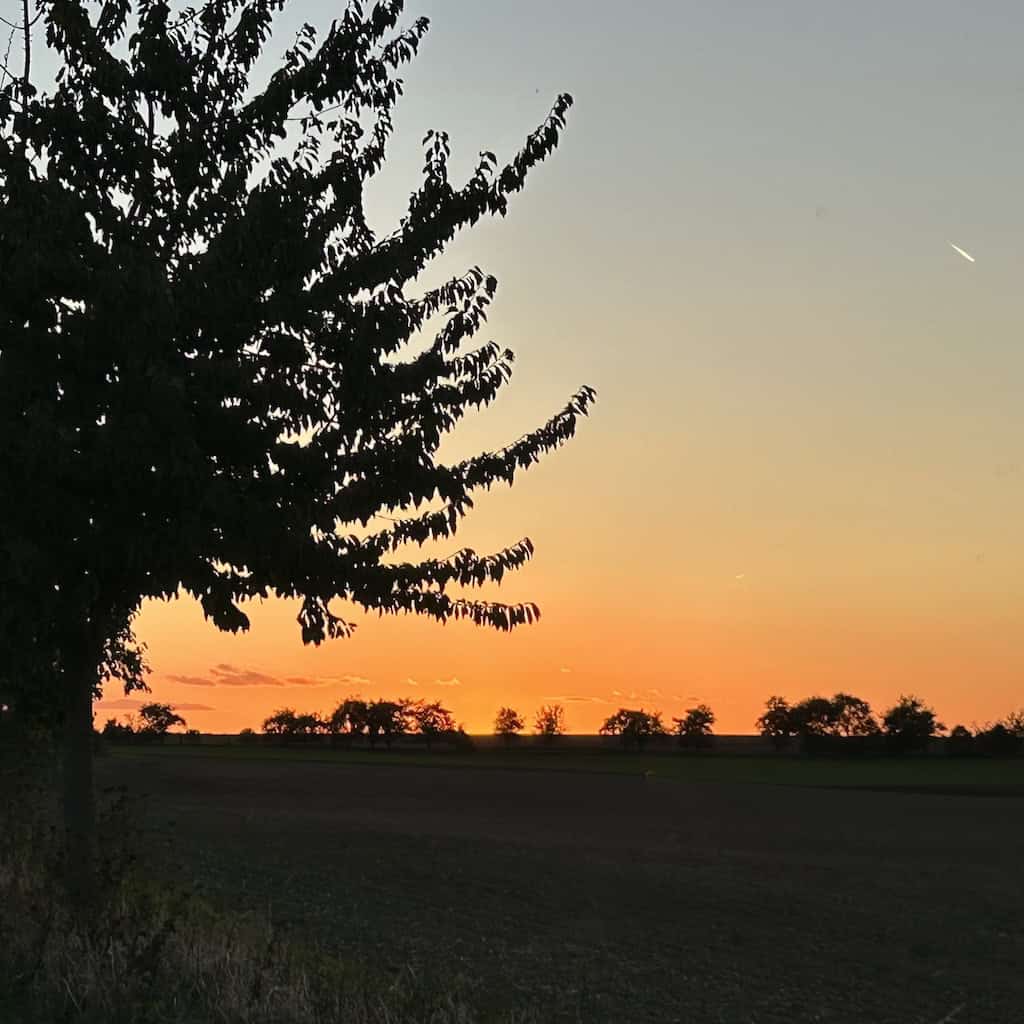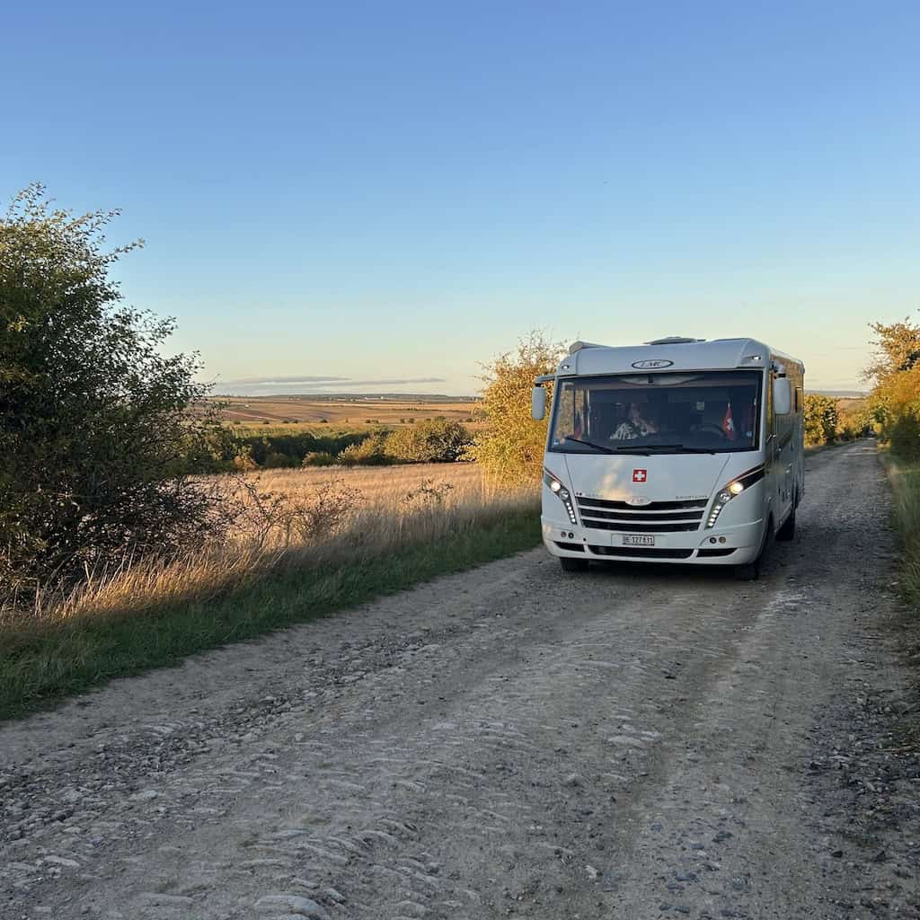 Es ist keine Umleitung signalisiert und unser gutes Navi schickt uns irgendwann über einen nicht enden wollenden steinigen Feldweg. Etwa 9 Kilometer werden sehr lang, wenn man nur noch im Schritttempo fahren kann. Wobei die Fahrt in den Sonnenuntergang auch seinen Reiz hat. Mit dem letzten Tageslicht erreichen wir den Stellplatz in Bad Tennstedt. Der liegt neben einer Sporthalle. Wir fragen, ob es hier in der Nähe eventuell eine Gaststätte gibt. Es wird uns im 5 Kilometer entfernten Herbsleben ein Grieche empfohlen. Aber fahren wollen wir heute nicht mehr.