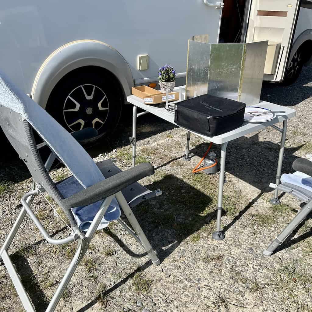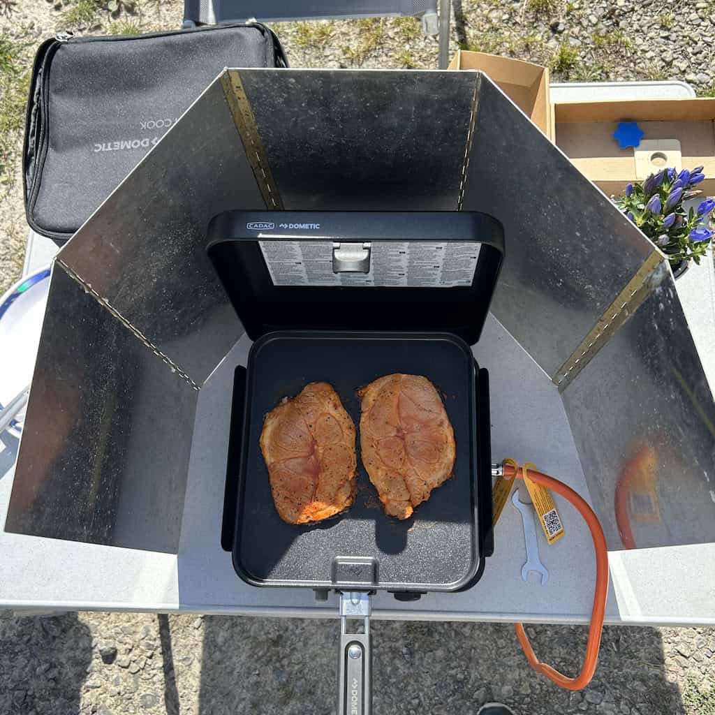 Die Sitzbezüge unserer Stühle weht es fast fort. Beim Grillen ist deshalb heute der Windschutz unbedingt erforderlich.
