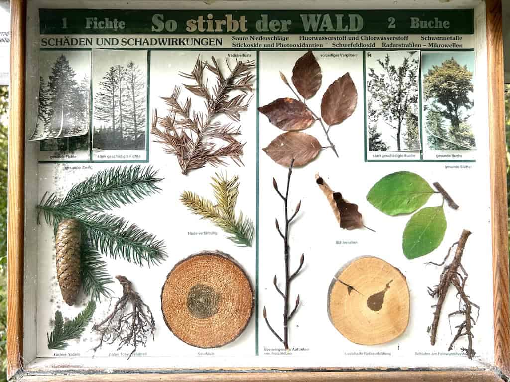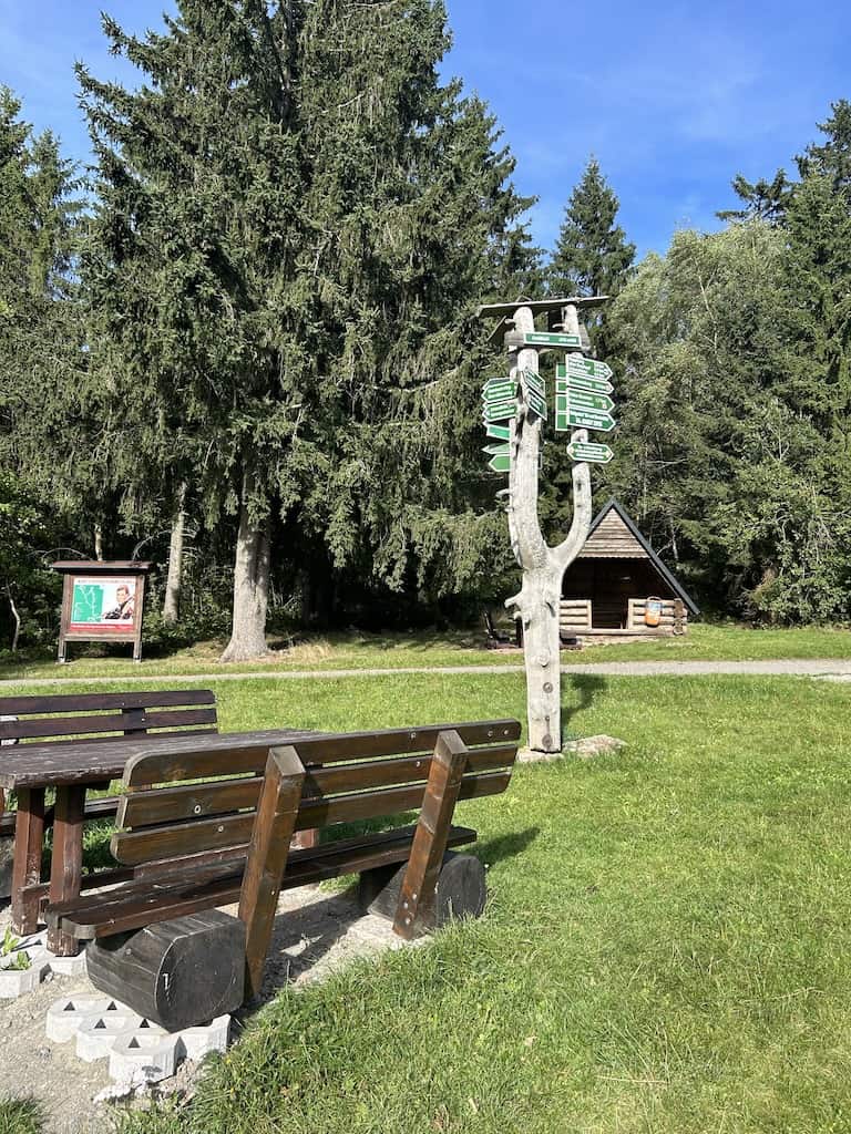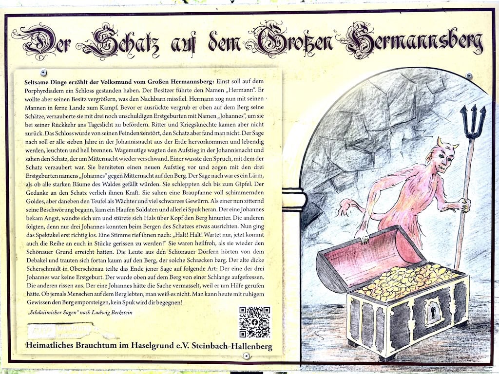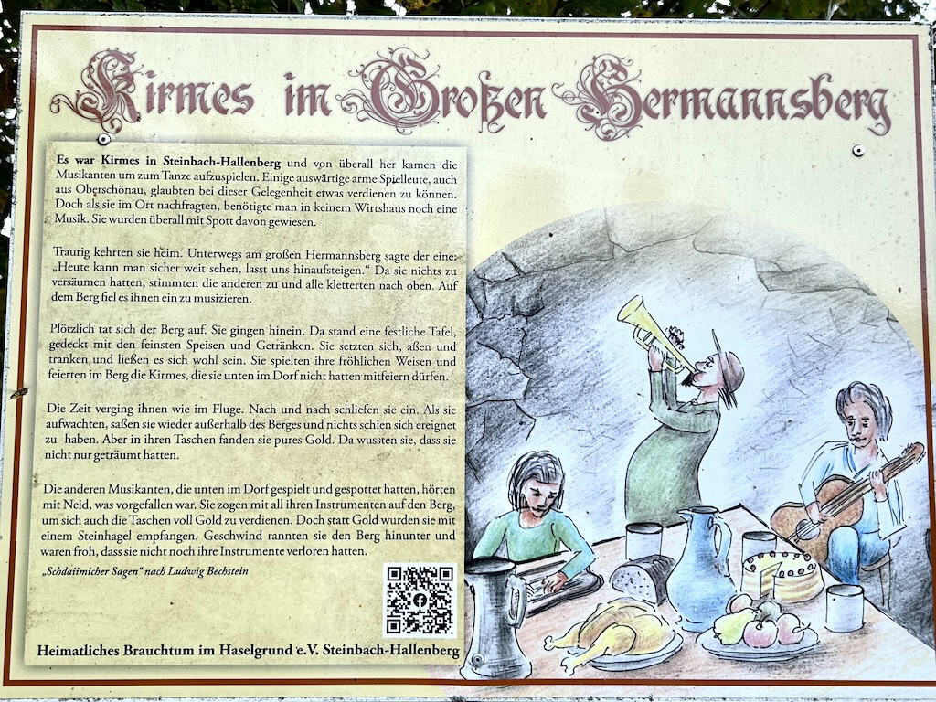 Dann entdecken wir auch Tafeln über heimatliches Brauchtum im Haselgrund, sogenannte „Schdaümicher Sagen“.