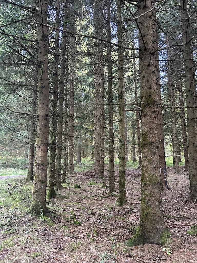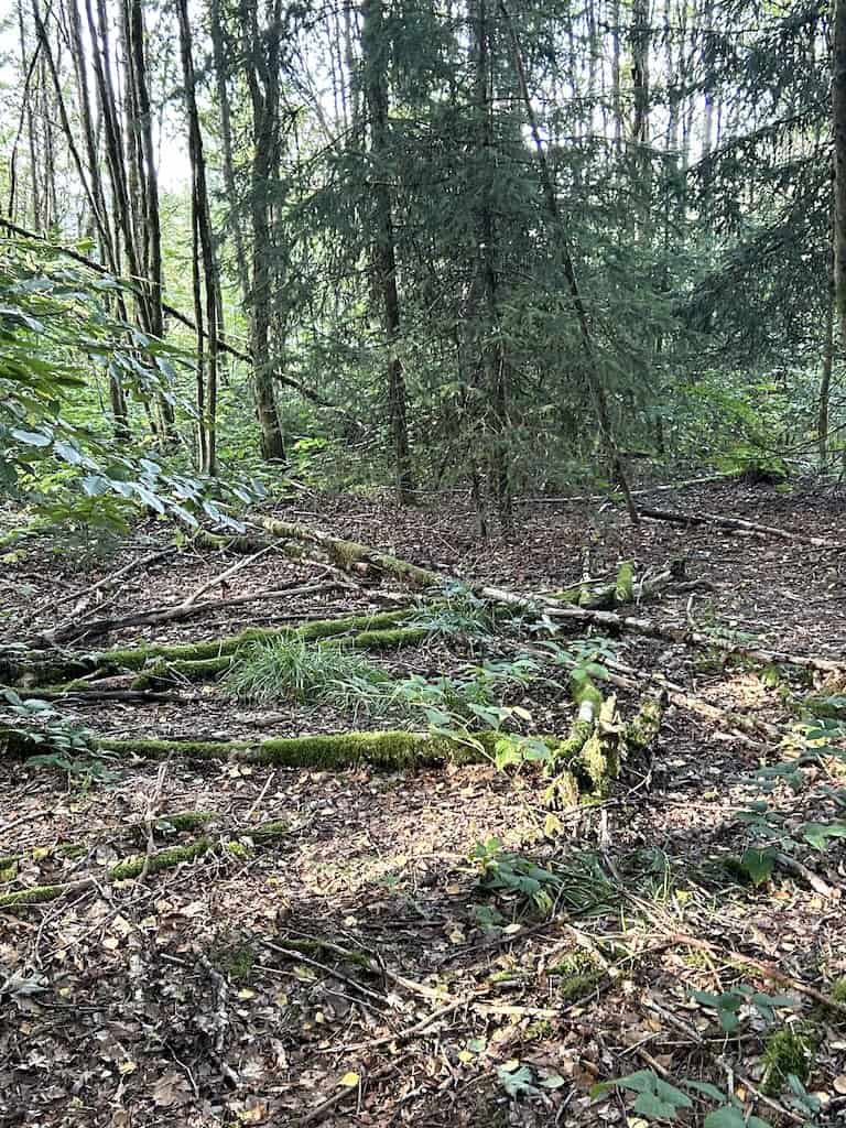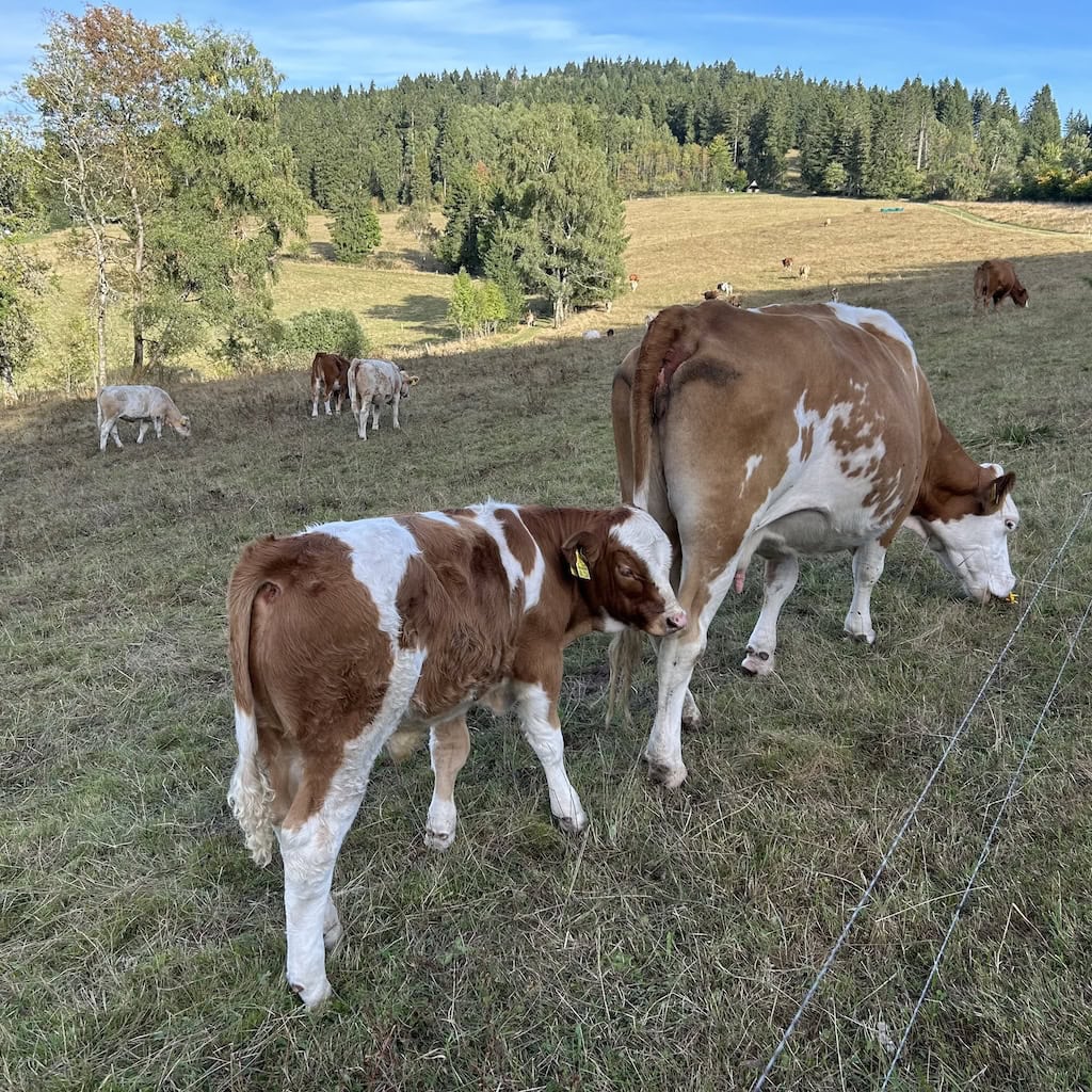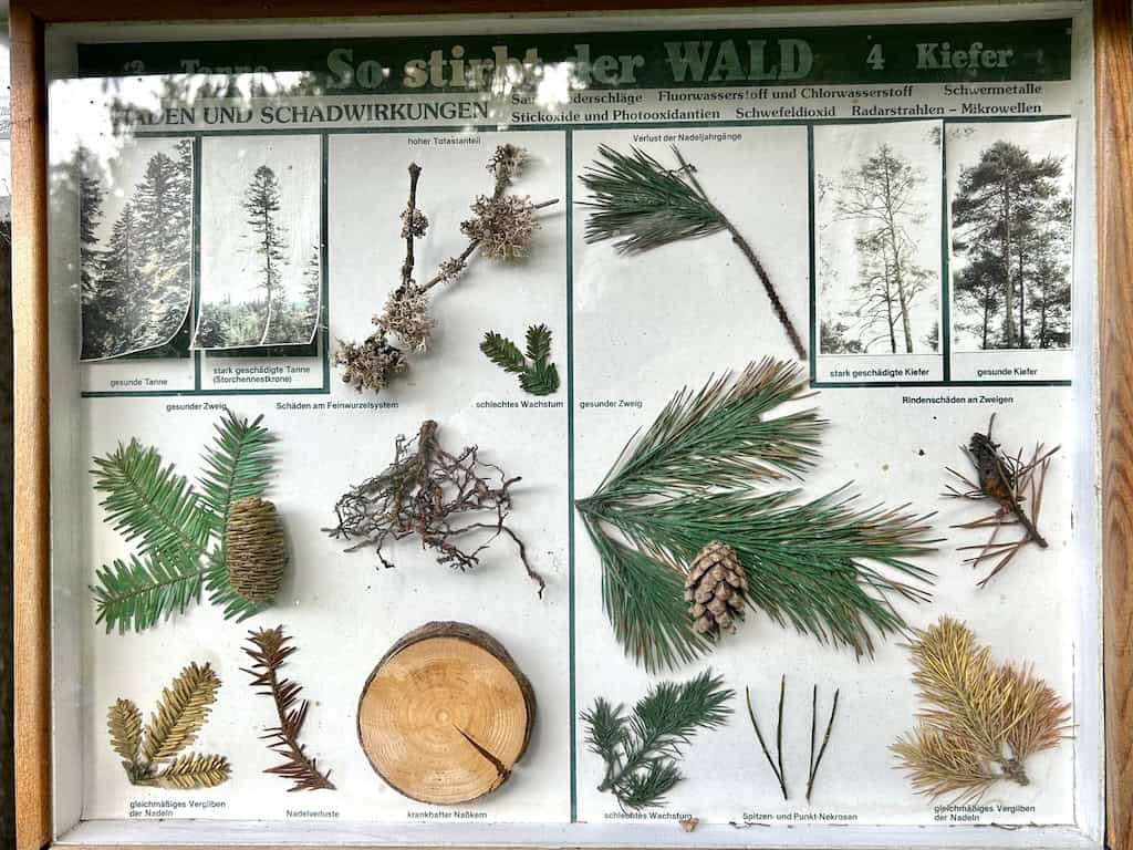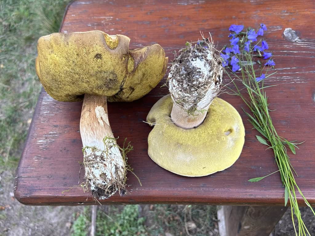 Im Schatten sind angenehme 24°. Auf dem offenen Feld, wo der heftige Wind bläst, sind wir trotzdem froh, dass wir unsere Windjacken dabeihaben. Wir treffen eine ältere Frau, die zwei riesige, aber immer noch geniessbare Steinpilze gefunden hat. Am Wegesrand sind da und dort Lehrtafeln über den Wald aufgestellt.