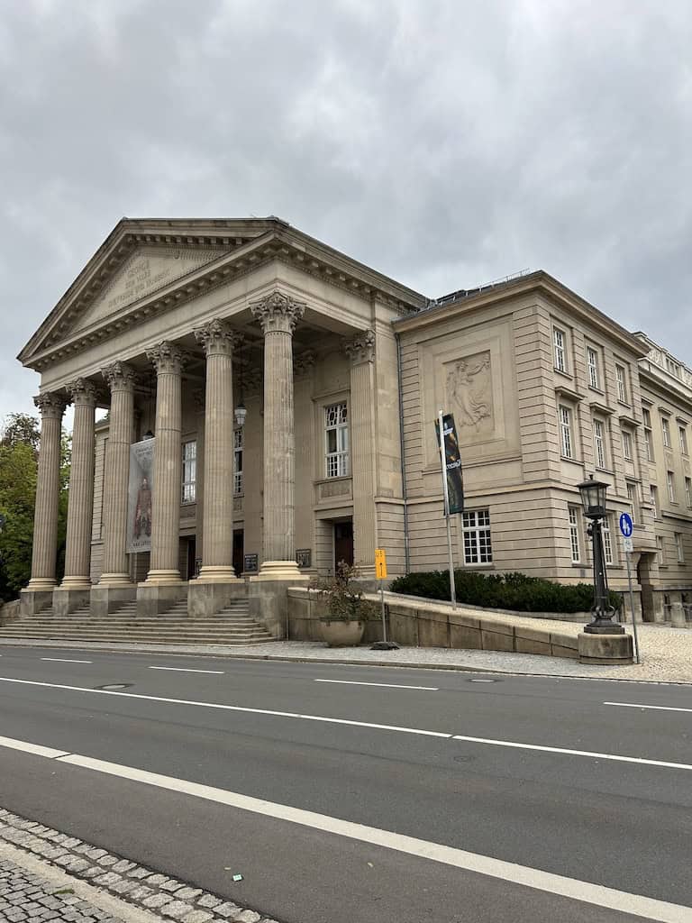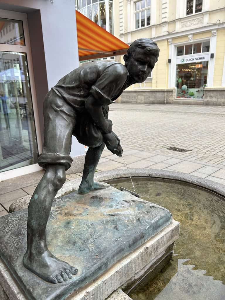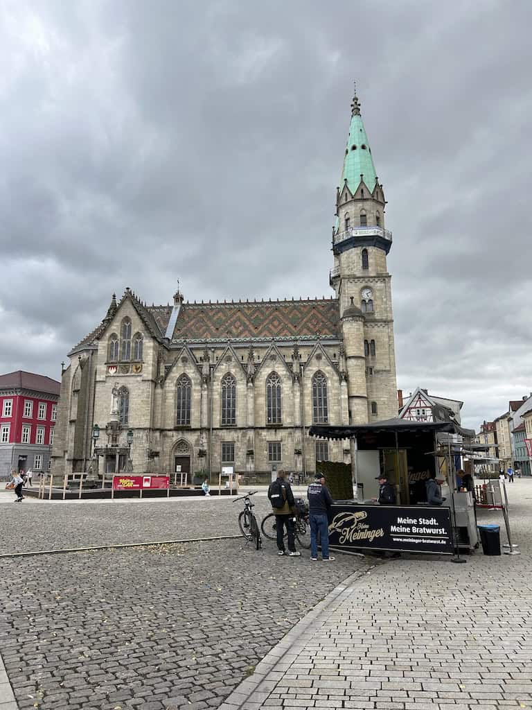 Wir starten im Regen nach Meinigen, unserem ersten Ziel, das wir – immer noch im Regen – erreichen. Auf einem Lidl-Parkplatz halten wir für einige Einkäufe und unsere Mittagsrast. Danach wird es glücklicherweise trocken, sodass wir zu einem Rundgang durch Meiningen starten können. Wir finden sogar einen Parkplatz im Zentrum.
