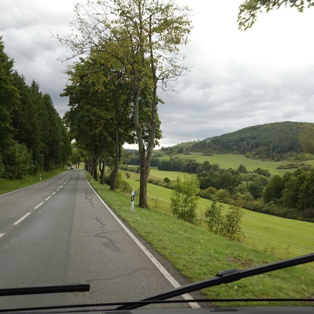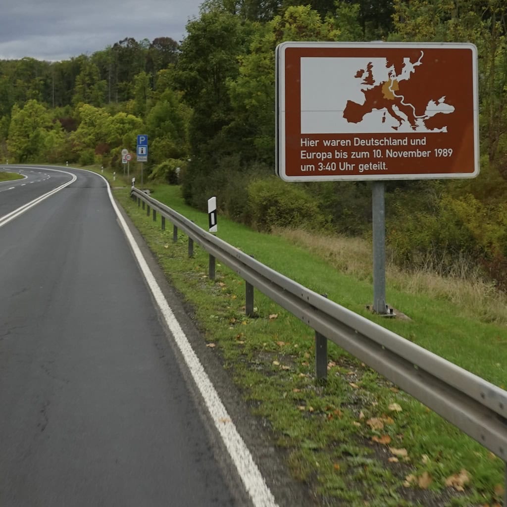 Auf der Weiterfahrt streifen wir den Ostrand der Rhön. Talwärts verlassen wir Thüringen und kommen nach Bayern. Eine Tafel erinnert an das bis 1989 geteilte Deutschland. Bald erreichen wir unseren Stellplatz am Rand von Bad Neustadt an der Fränkischen Saale.