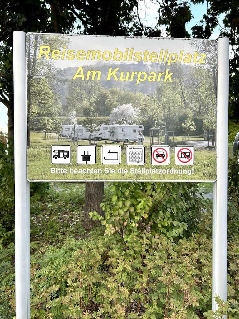 Wir nützen die Ver- und Entsorgungsanlage gerade noch bei Trockenheit. Wenig später setzt der Regen ein, der uns bis auf den Stellplatz in Euerbach begleitet. Hier gibt es offiziell nur 4 Plätze. Zwei sind schon belegt und kurz nach uns ist auch der letzte freie Platz weg. Wir stehen zum Glück auf ebenem und festem Untergrund und müssen bei dem momentanen Starkregen nicht ins Freie.