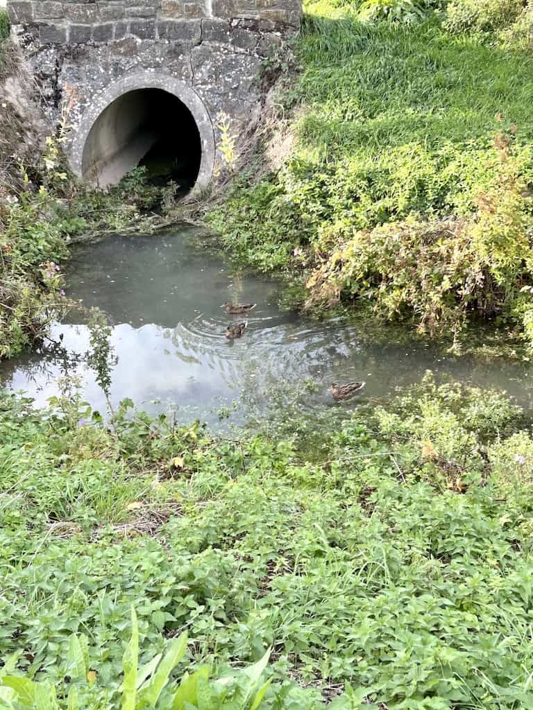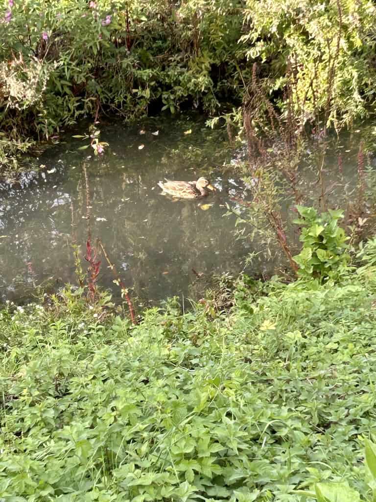 Der Stellplatz am Kurhaus hat 50 numerierte Parzellen, davon sind momentan aber höchstens 10 belegt. Es ist schön, dass man nicht in Reih und Gleid steht, sondern kreuz und quer verteilt auf zwei Ebenen. Dazwischen ist ein Graben, dessen Wasser aber verdächtig trüb daherkommt. Den Enten scheint es trotzdem zu gefallen.
