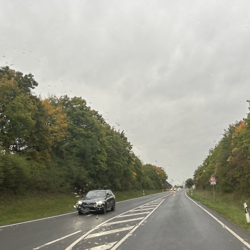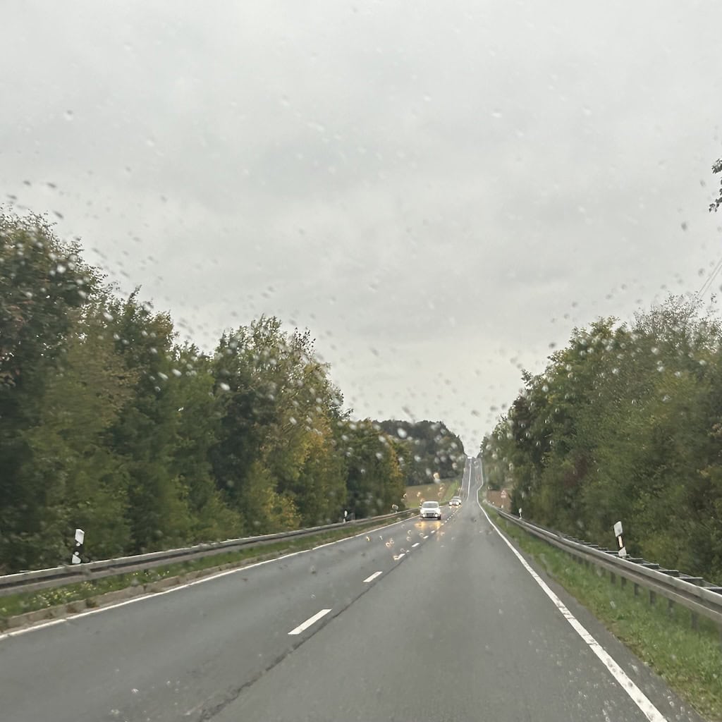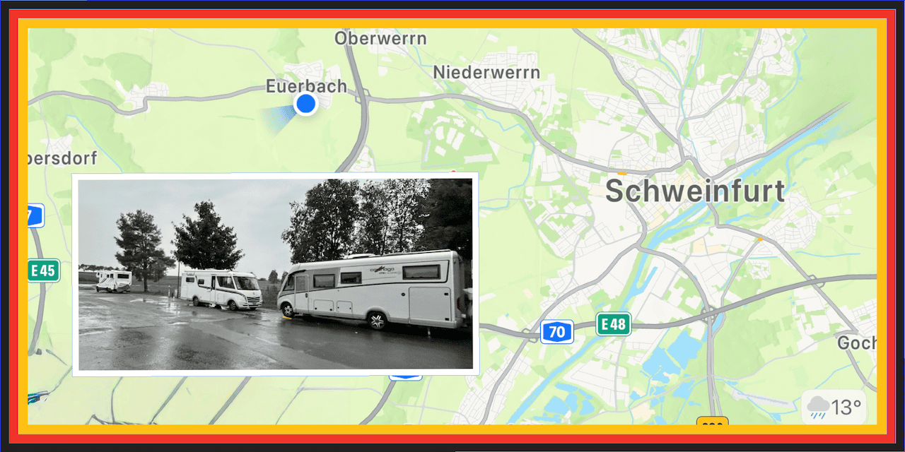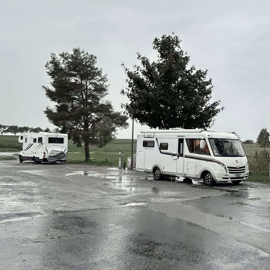 Wir nützen die Ver- und Entsorgungsanlage gerade noch bei Trockenheit. Wenig später setzt der Regen ein, der uns bis auf den Stellplatz in Euerbach begleitet. Hier gibt es offiziell nur 4 Plätze. Zwei sind schon belegt und kurz nach uns ist auch der letzte freie Platz weg. Wir stehen zum Glück auf ebenem und festem Untergrund und müssen bei dem momentanen Starkregen nicht ins Freie.