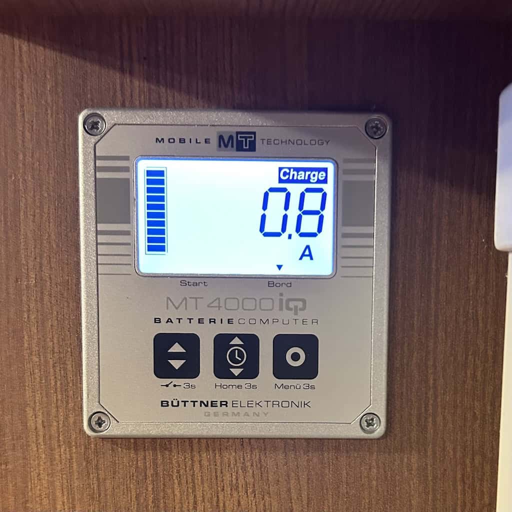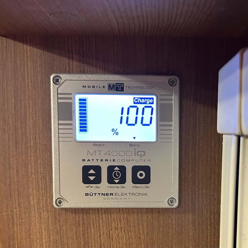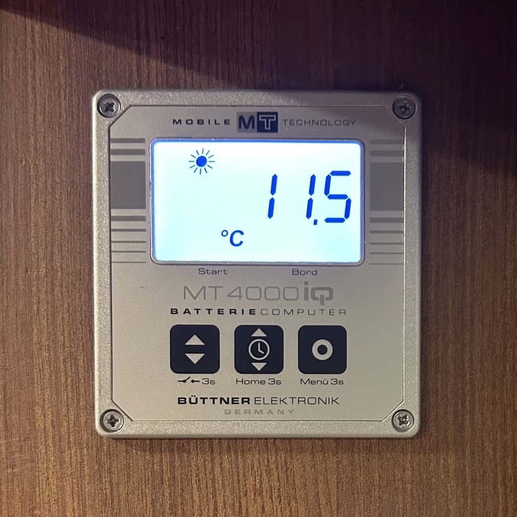 Nun hängen wir für einige Stunden am Landstrom, damit sich die Anzeige wieder neu auf 100% kalibrieren kann. Danach haben wir wieder volle Kontrolle über die Batterien und haben zudem wieder eine weitere Anzeige der Innen- und Aussentemperatur.