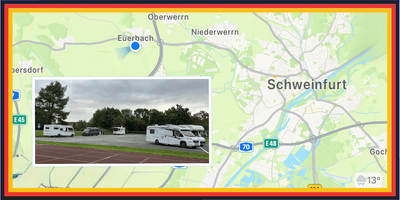 Wir fahren wieder auf den Stellplatz am Sportplatz in Euerbach, wo wir vorgestern schon waren. Hier installiert Michael den BatterieComputer wieder, der nach einer Reparatur zu Hans und Uli geschickt wurde.