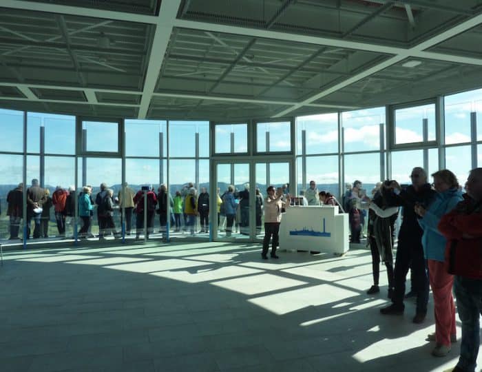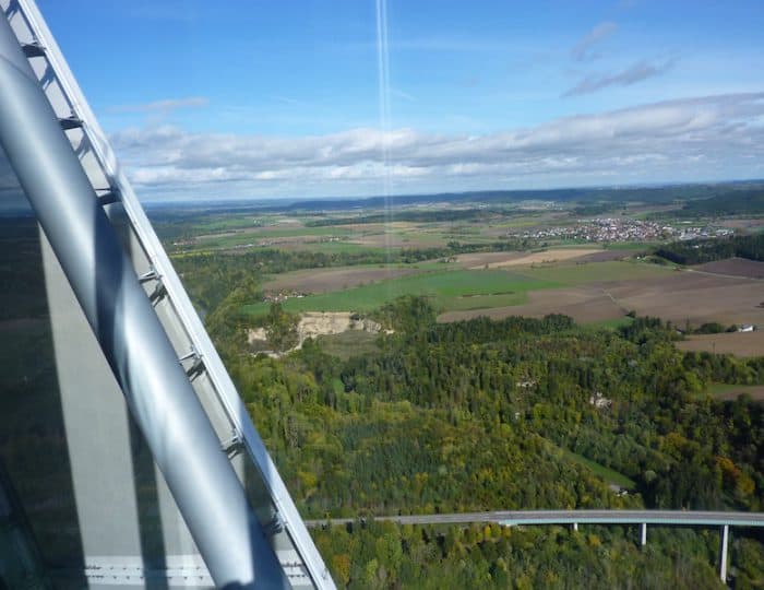 Der 246 Meter hohe Turm dient Thyssen der Erprobung neuer Liftsysteme. Er ist aber auch ein touristischer Anziehungspunkt. In 30 Sekunden sind wir mit dem Lift auf der Aussichtsplattform in 232 Meter Höhe. Zu Fuss wären es 1390 Stufen.