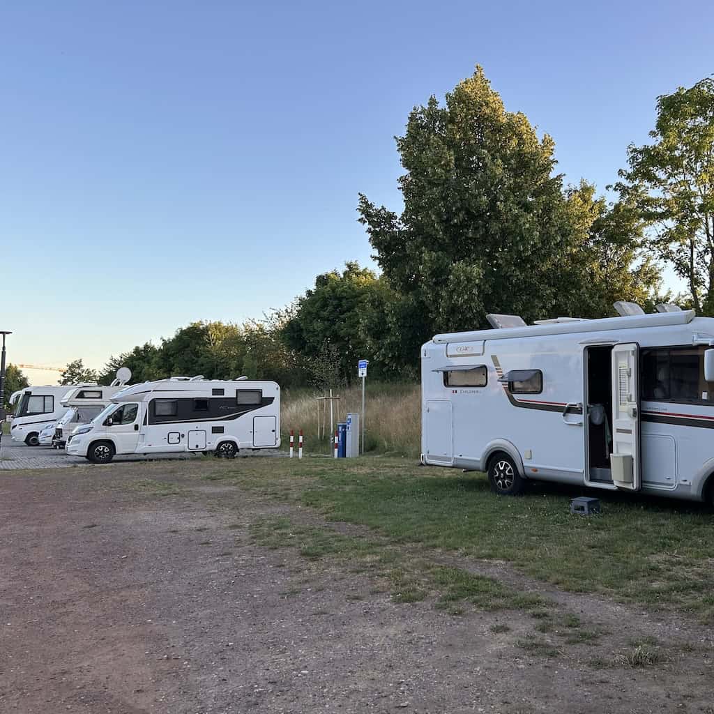 Mit den letzten Sonnenstrahlen erreichen wir den Stellplatz in Warmsroth bei Stromberg. Alle Plätze sind schon belegt, allerdings ist der Ausweichplatz auf der Wiese für uns auch nicht schlecht.