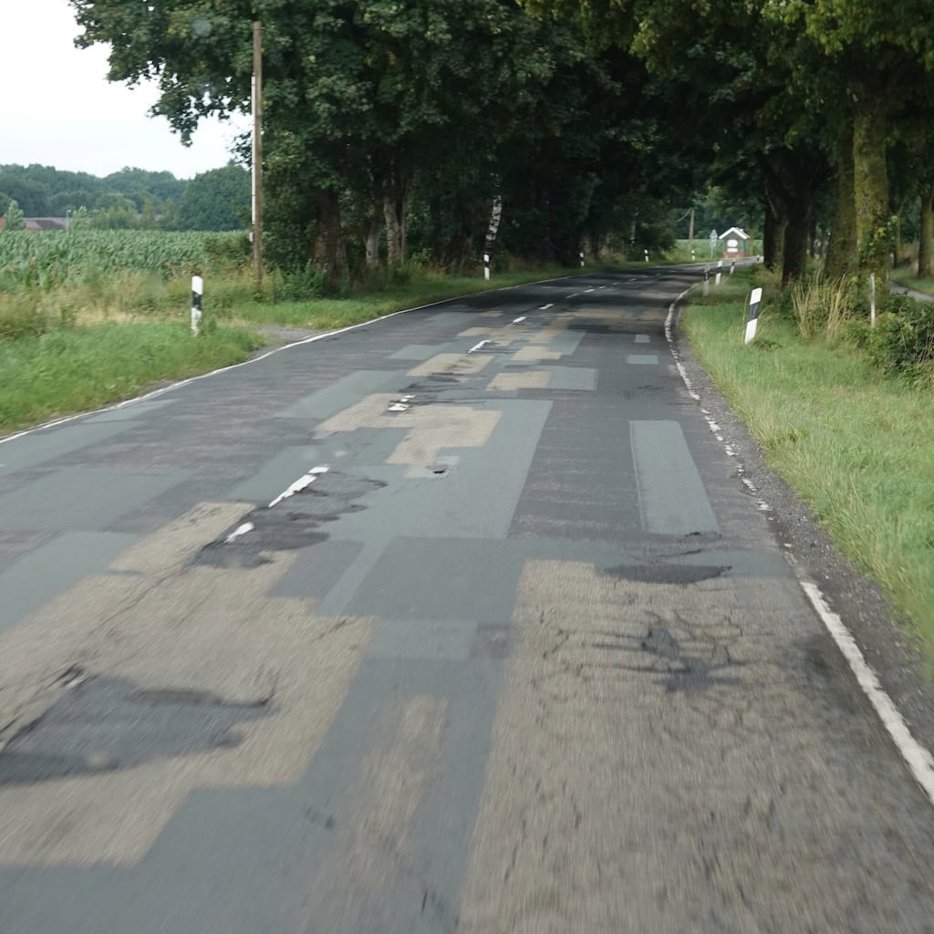Wir fahren Landstrasse und die ist hier in einem miserablen Zustand. Eine Flickstelle neben der anderen. Es holpert, dass wir Angst um unsere Einrichtung haben.