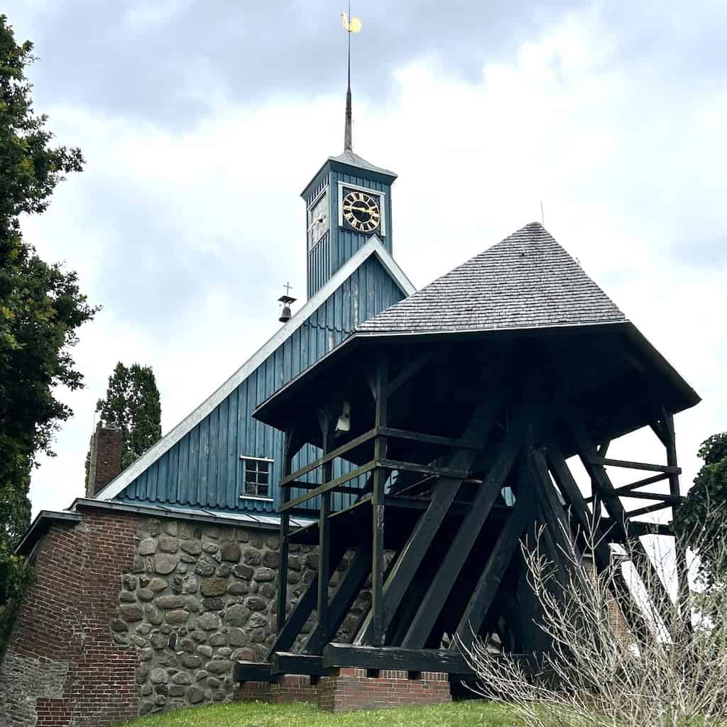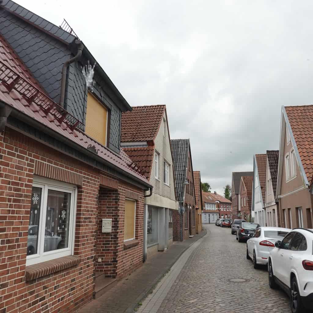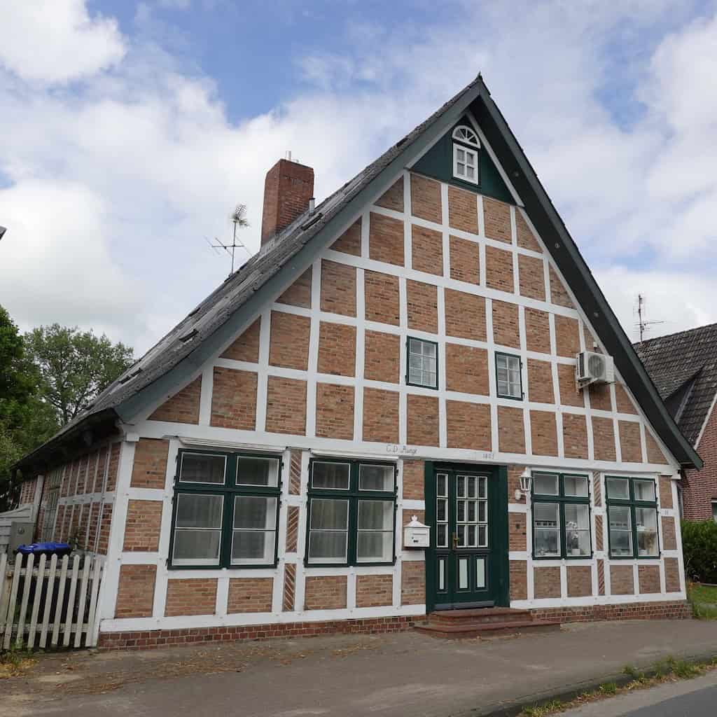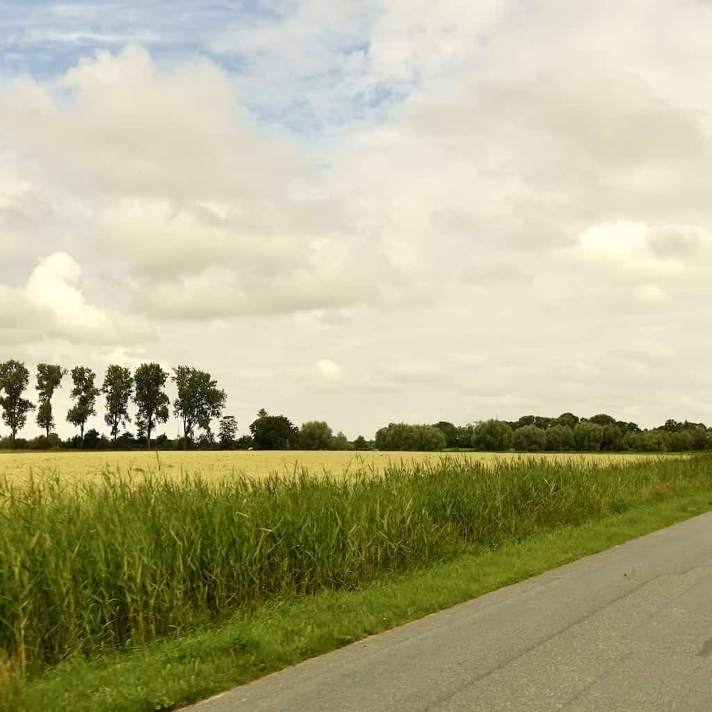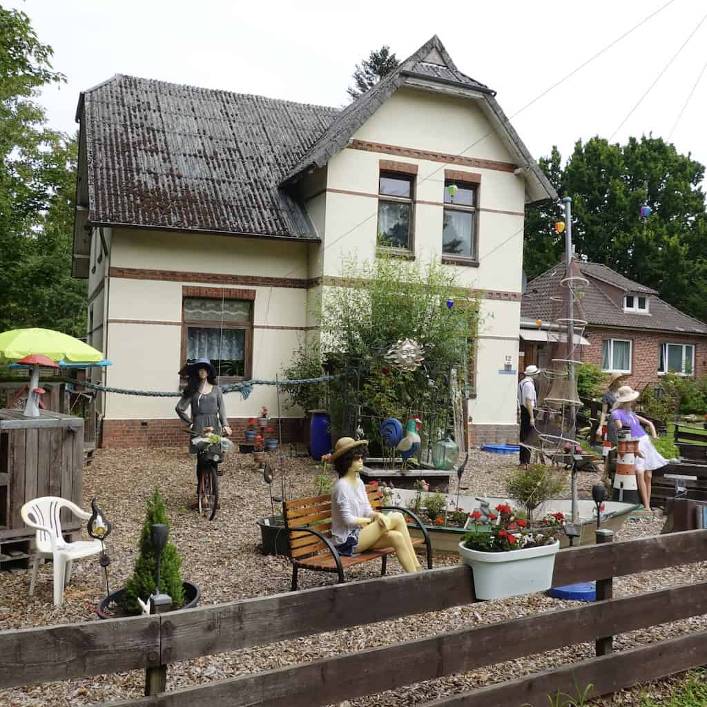 Wir kommen an typischen Häusern, einem Kirchturm mit aussenhängender Glocke, durch enge Strassen, weiten Feldern und an kuriosen Vorgärten vorbei. Immer in Richtung Elbfähre Wischhafen.