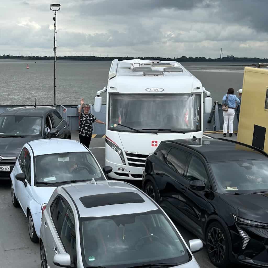 Nach einer Stunde Kolonnenfahrt werden wir als letztes Fahrzeug auf die Fähre gewunken. Es sind 4 Fähren im Einsatz. Trotzdem kommt es heute zu einer langen Wartezeit. Da hatten wir die letzten Male wohl immer Glück, denn da konnten wir immer gerade auf’s nächste Schiff fahren.