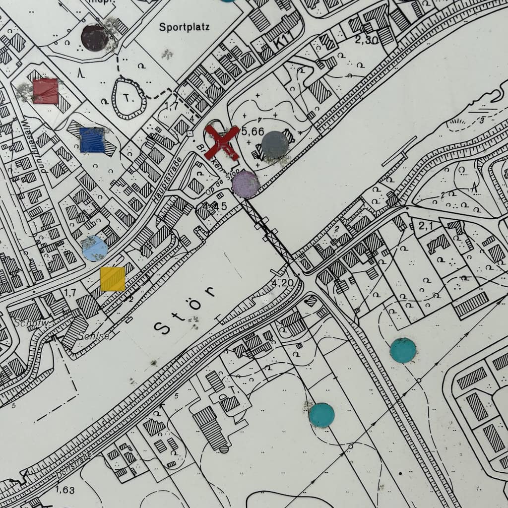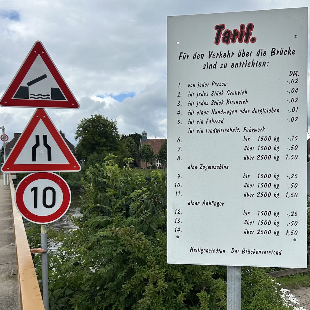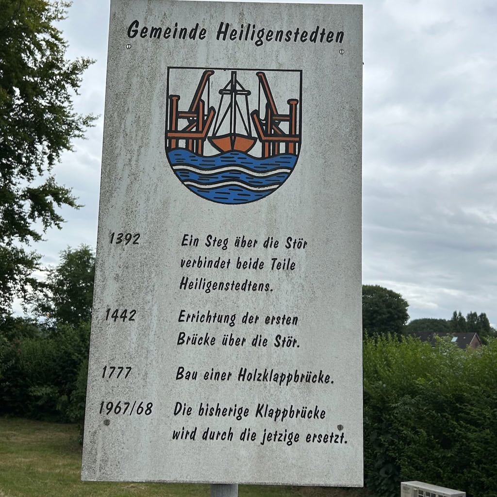 Wir fahren auf einer kleinen Strasse unterhalb des Deichs der Stör entlang. Überall kleine, meist mit Reet gedeckte Häuser. In Heiligenstedten überqueren wir die Stör.