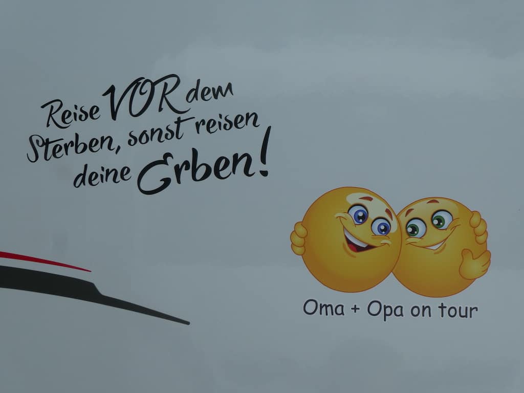 Der Camper vor uns hat diverse Sprüche an seinem Camper. Nebenan, bei den Wohnwagen, steht ein Trabi-Oldtimer mit witzigem Schick-Schnack.