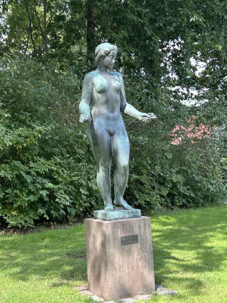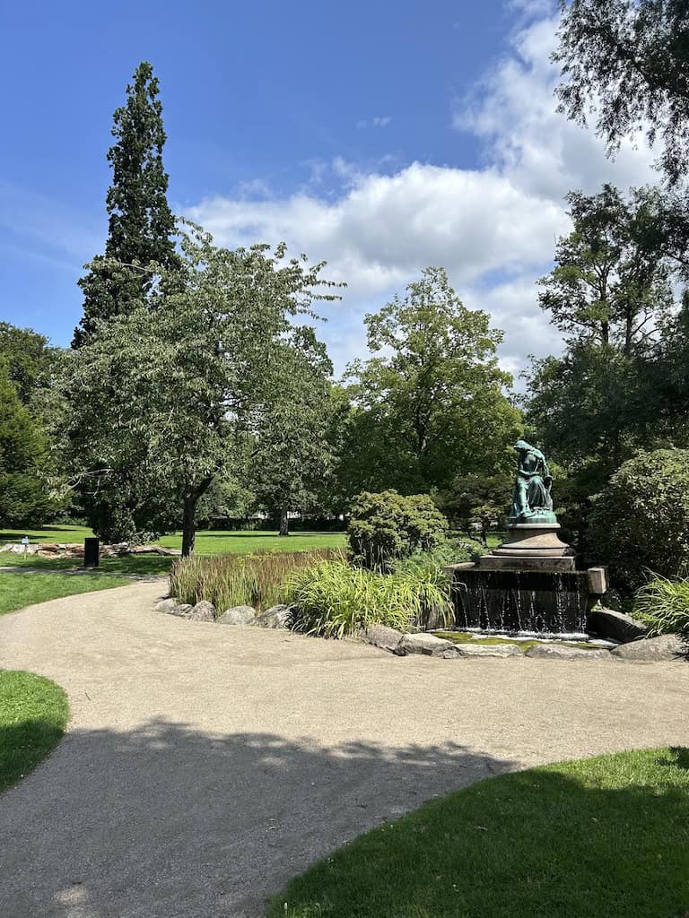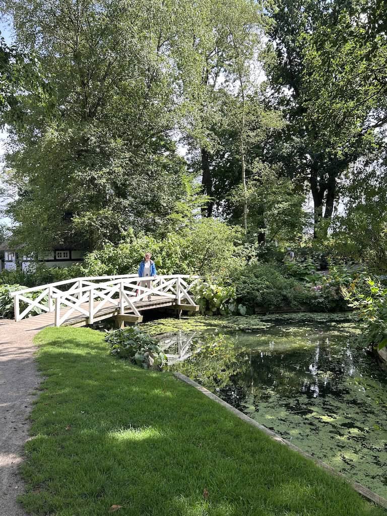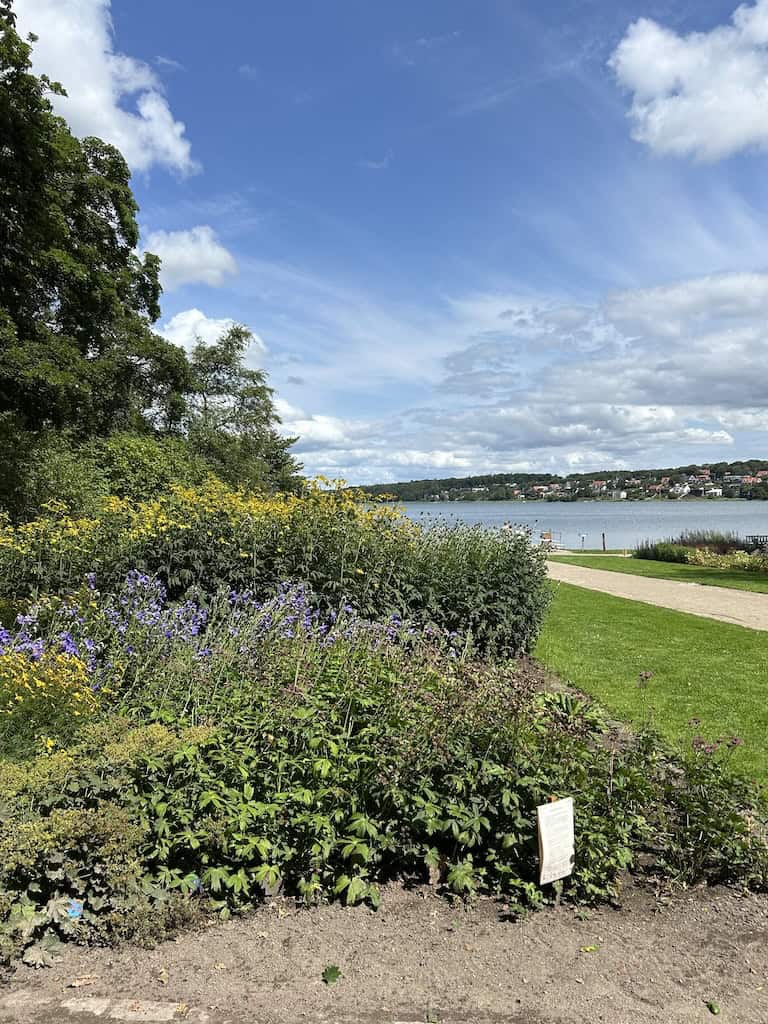 Gleich gegenüber von unserem Parkplatz befindet sich ein wunderschöner Park mit gewundenen Wegen, kleinen Kanälen und Brücken. Er grenzt ans Wasser des Nørresø (See).