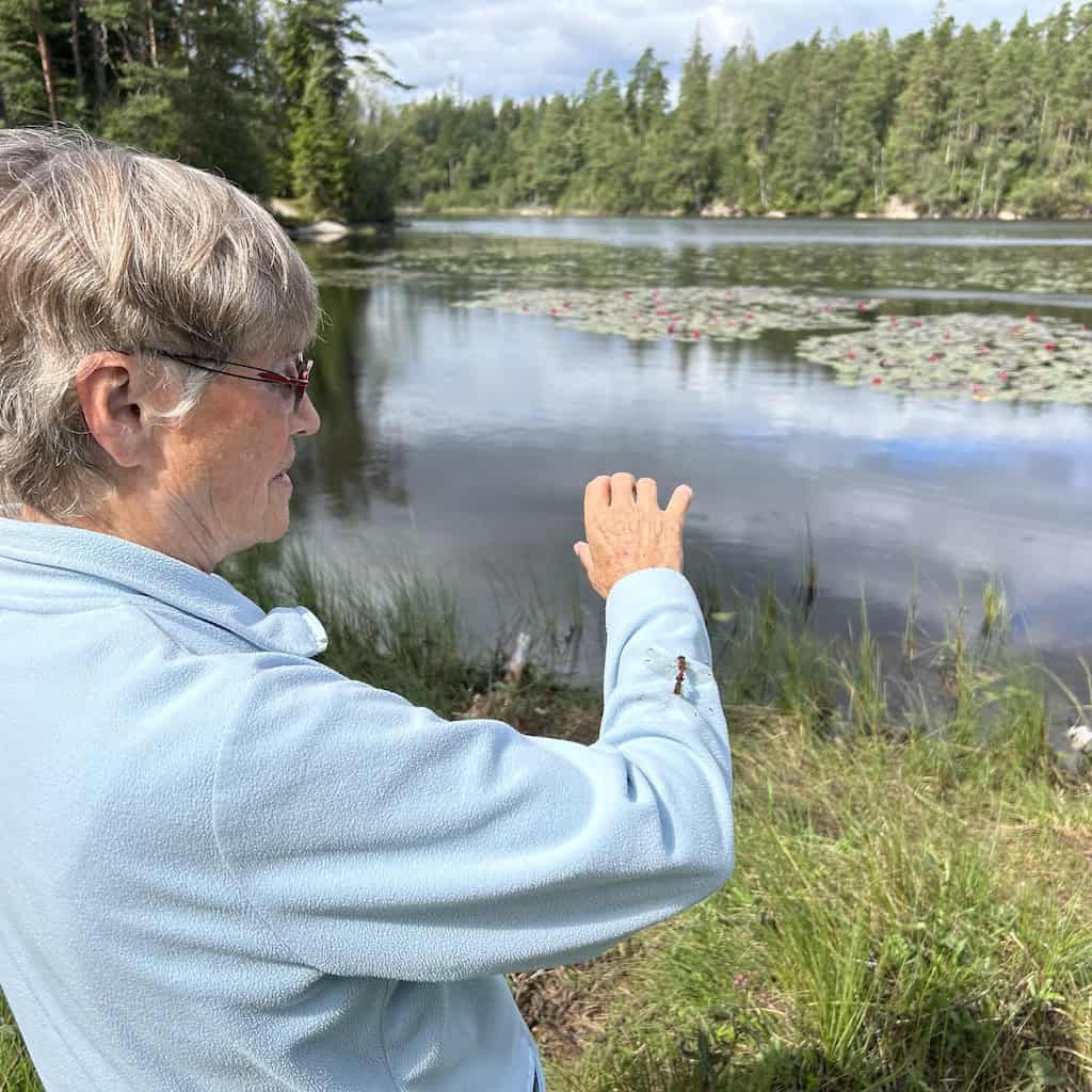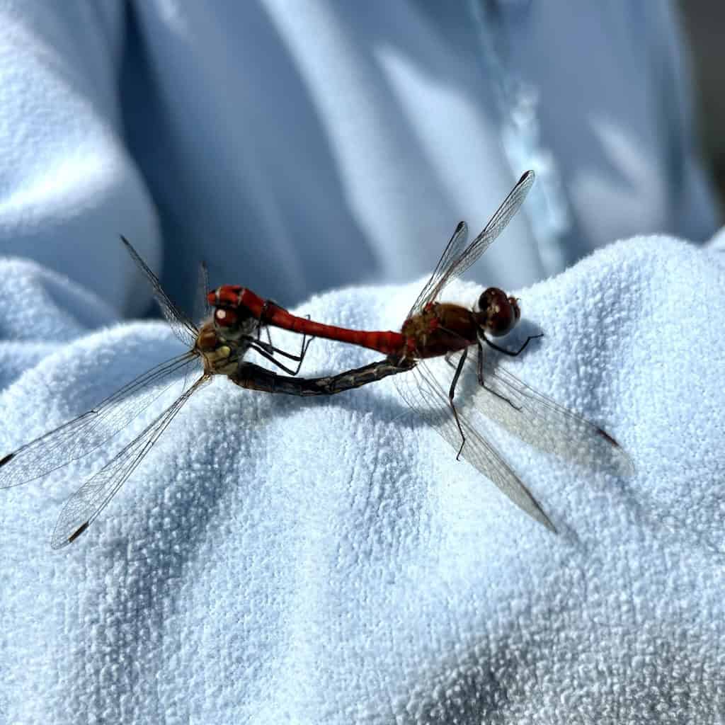 Die Paarung von Libellen scheint ein längerer Akt zu sein. Sie ruhen sich auf Renates Arm etwas aus