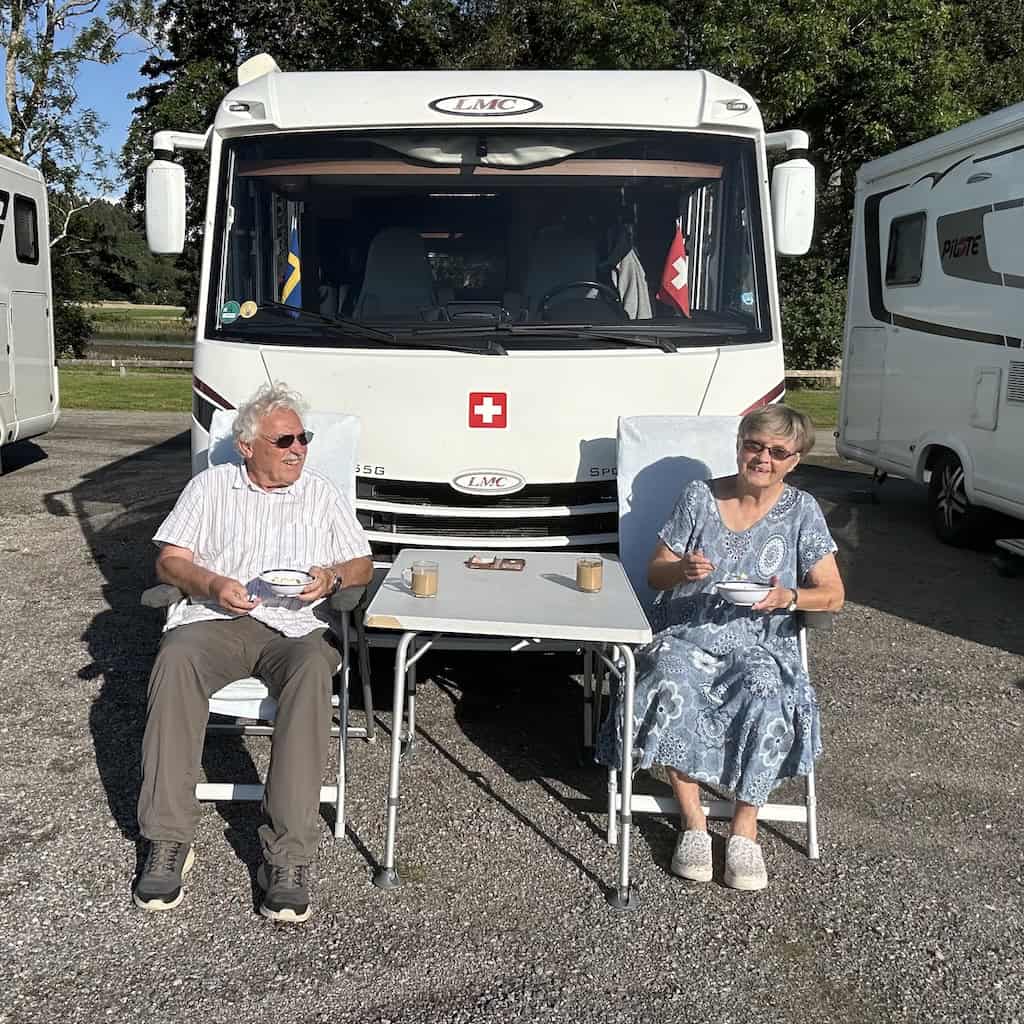 Die Abendsonne lockt alle aus ihren Campern. Unsere Nachbarn auf der einen Seite kommen – einmal mehr – aus den Niederlanden Sie sind 10 Jahre jünger als wir und waren früher auch Segler. Auf der anderen Seite stehen sehr nette Schweden. Mit beiden haben wir sofort Kontakt.