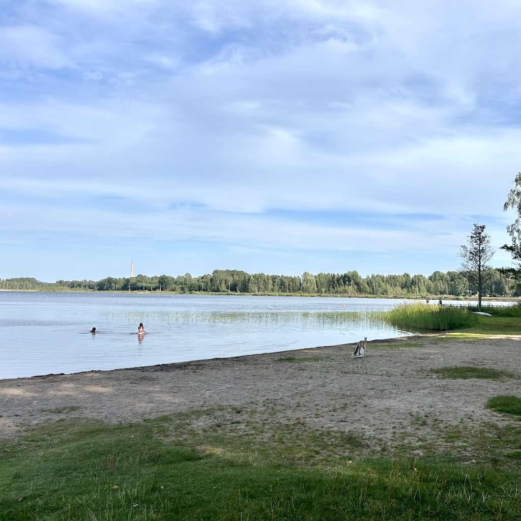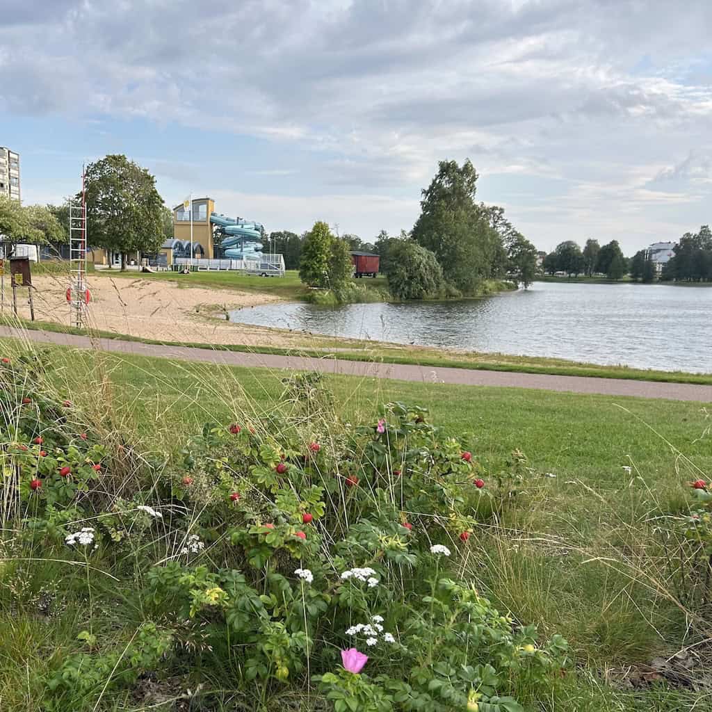 Es stehen 7 Camper hier, aber mit uns sind nur 2 davon bewohnt. Alles andere sind wohl «kalte Betten», vermutlich von Anwohnern hier abgestellt. Die Umgebung ist ein Stadterholungsgebiet mit viel Wiese, einem Spielplatz und einem kleinen See.