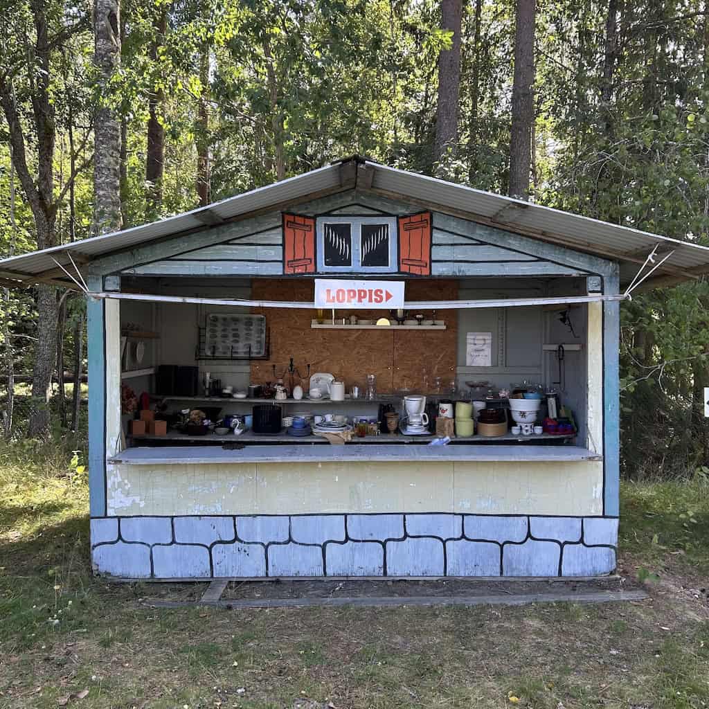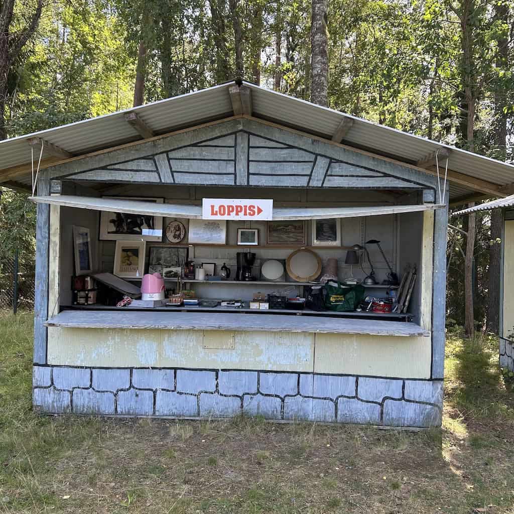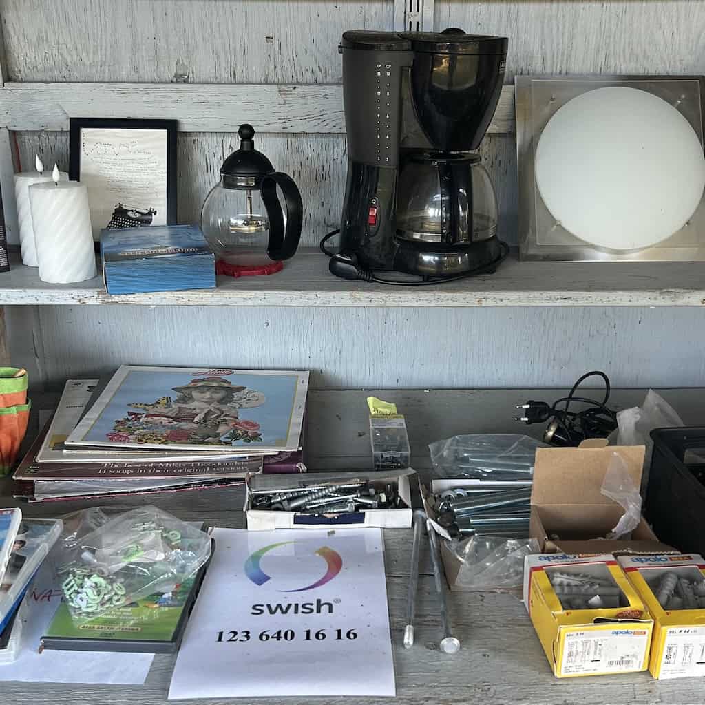 Die Loppis = Flohmarkt-Buden stehen hier offen, ganz ohne Personal. Bezahlt wird auf Vertrauensbasis per Swish, einem mobilen Zahlungssystem in Schweden.