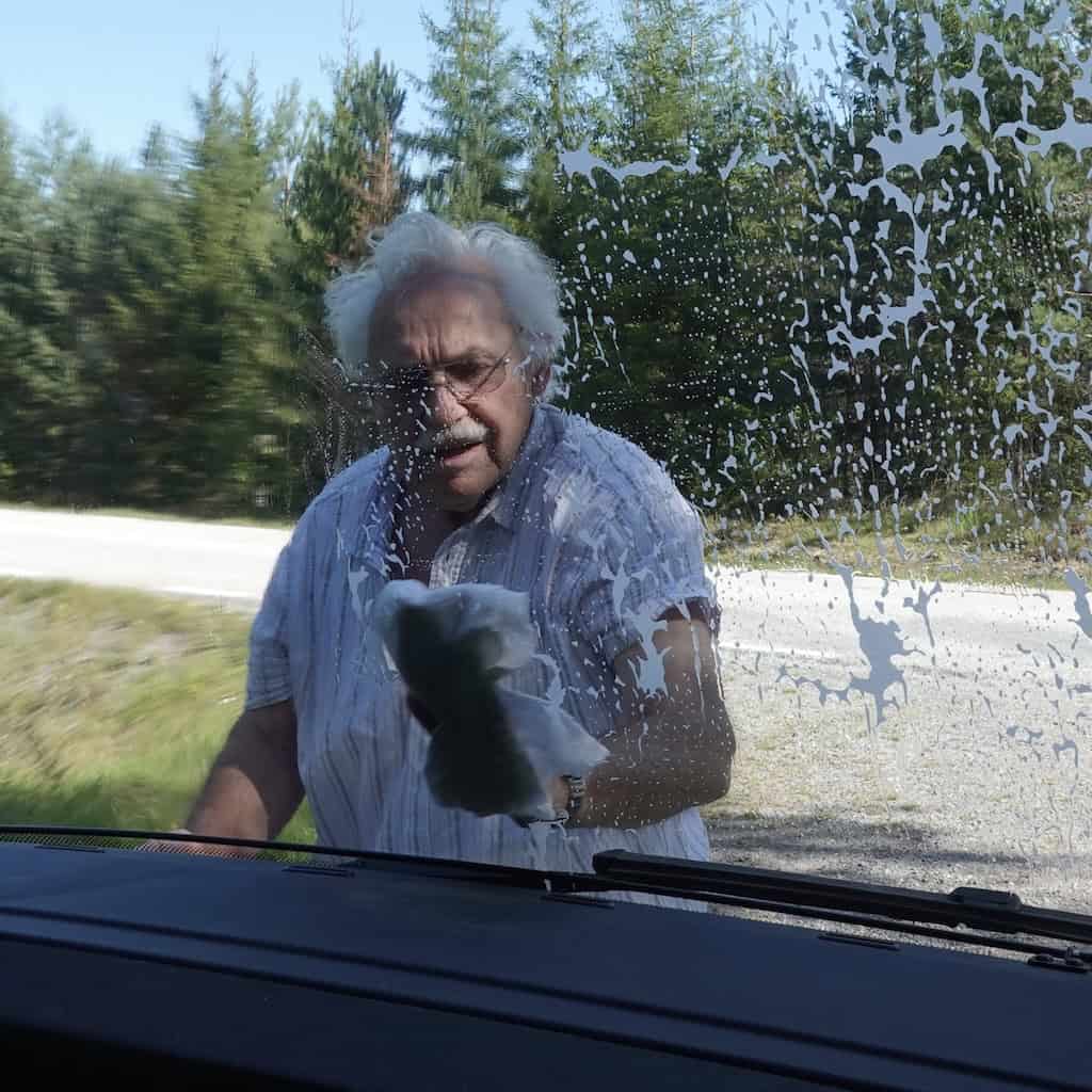Kaum sind wir unterwegs, merken wir, wie schmutzig unsere Frontscheibe ist. Also halten wir bei nächster Gelegenheit und bringen das in Ordnung.