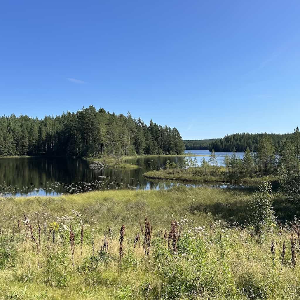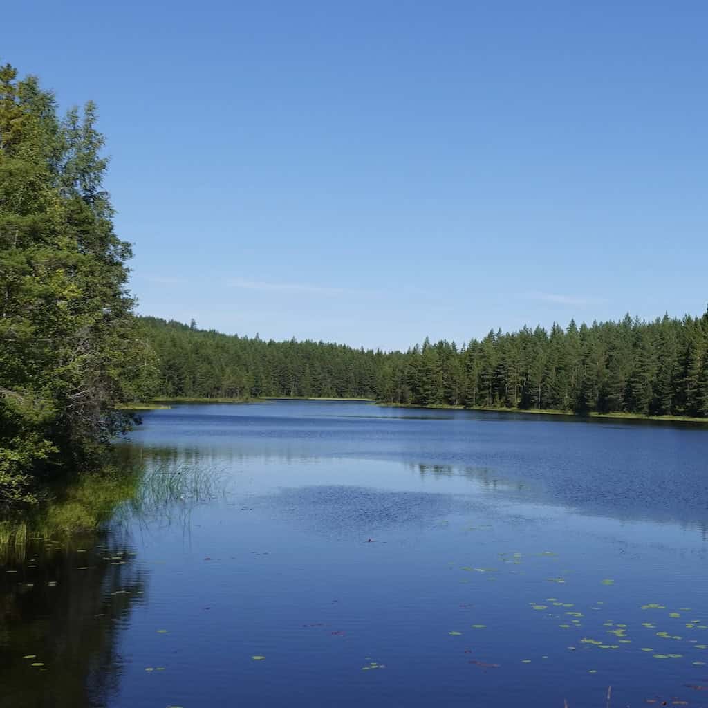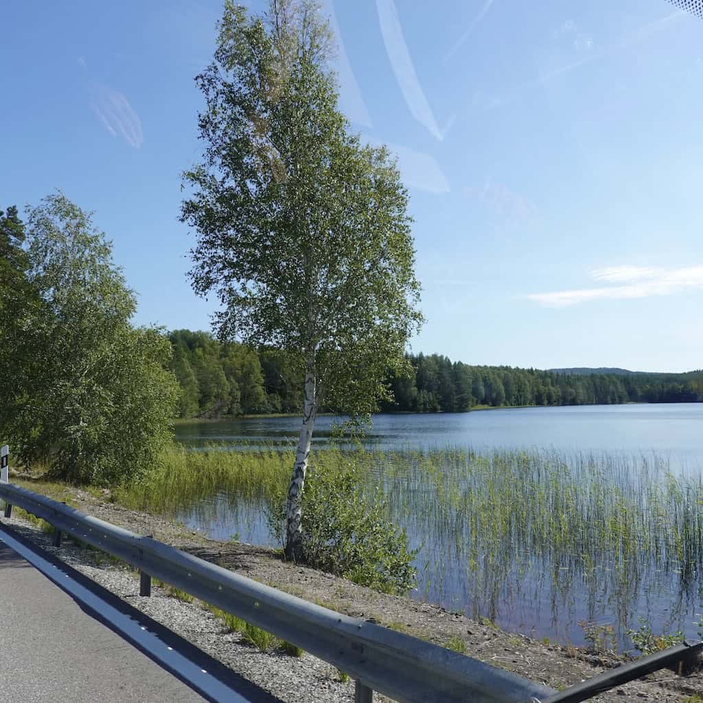 Wieder geht es durch endlose Wälder und vorbei an malerischen Seen. Etwas abseits der Strasse finden wir einen geeigneten Mittags-Rastplatz. An der Sonne ist es hier so heiss, dass wir unsere Aussendusche wieder einmal benützen.
