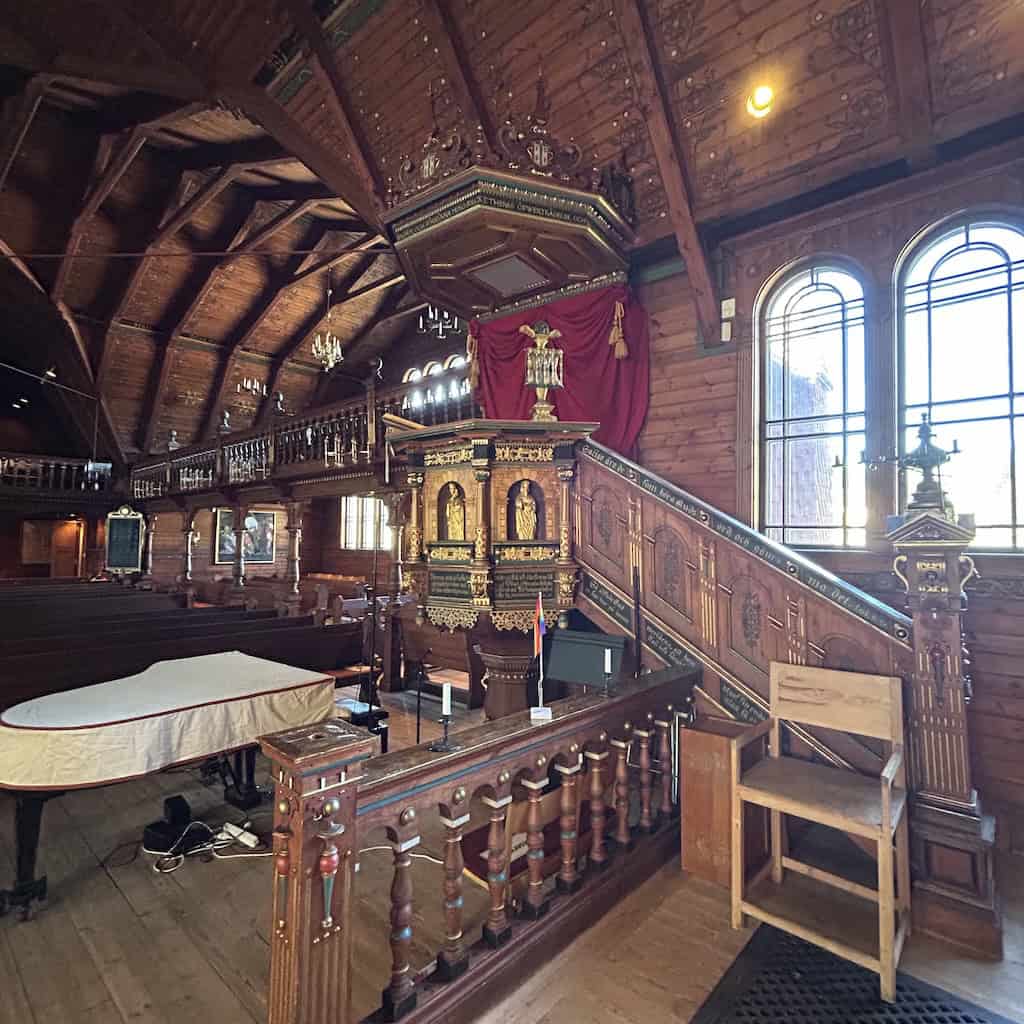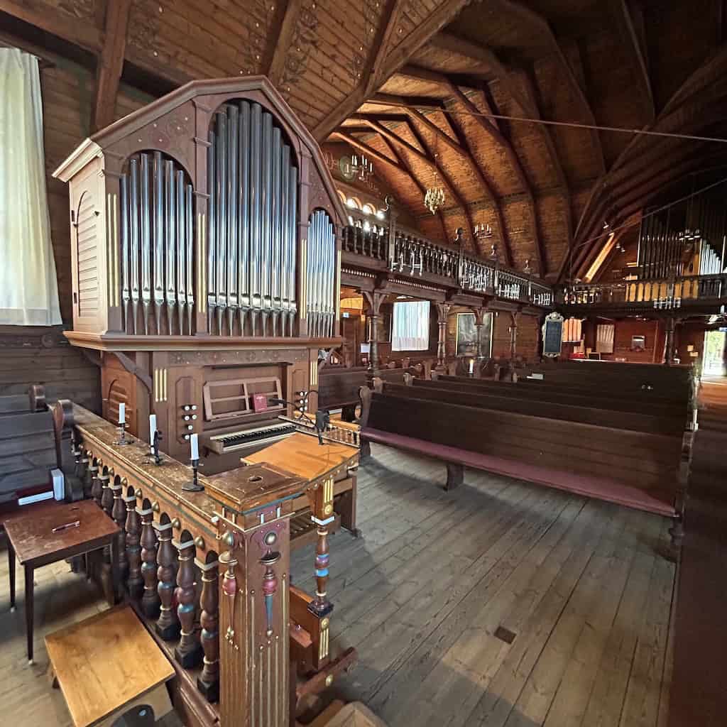 Herausragend ist die Holzkirche, deren Grundsteinlegung 1635 war. Ein wahres Bijou. Aussergewöhnlich ist auch der abseits stehende Glockenturm, erstmals 1640 errichtet und in seiner heutigen Form aus dem Jahr 1661. Er steht abseits der Kirche, sogar durch eine Strasse getrennt. Daneben befinden sich kleine Hütten. Es sind die ehemaligen Ställe für die Pferde der Kirchgänger, die per Pferd zum Gottesdienst kamen. 1891/92 wurde die Kirche umfassend restauriert.