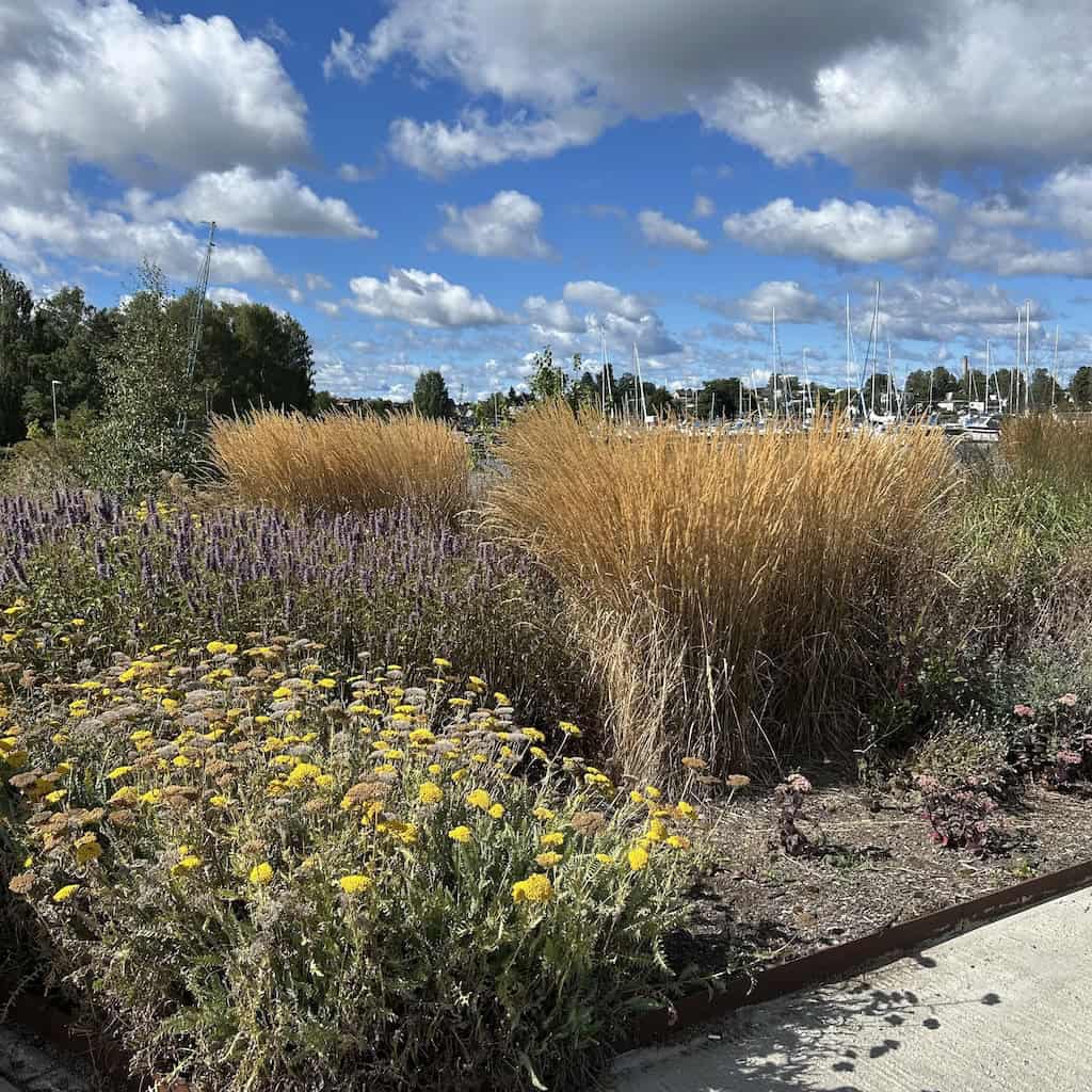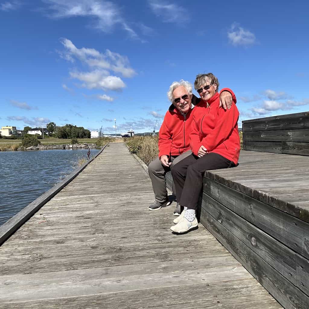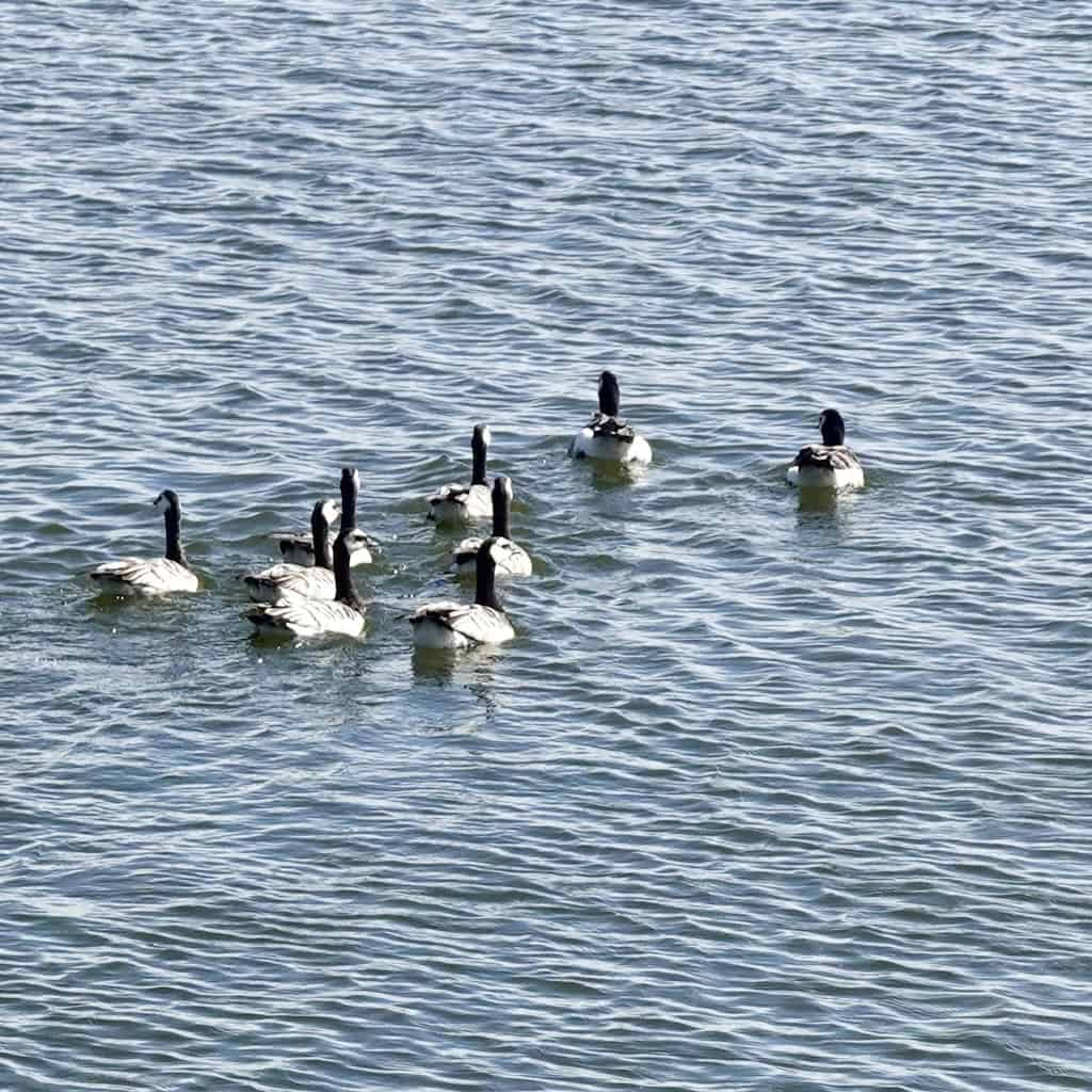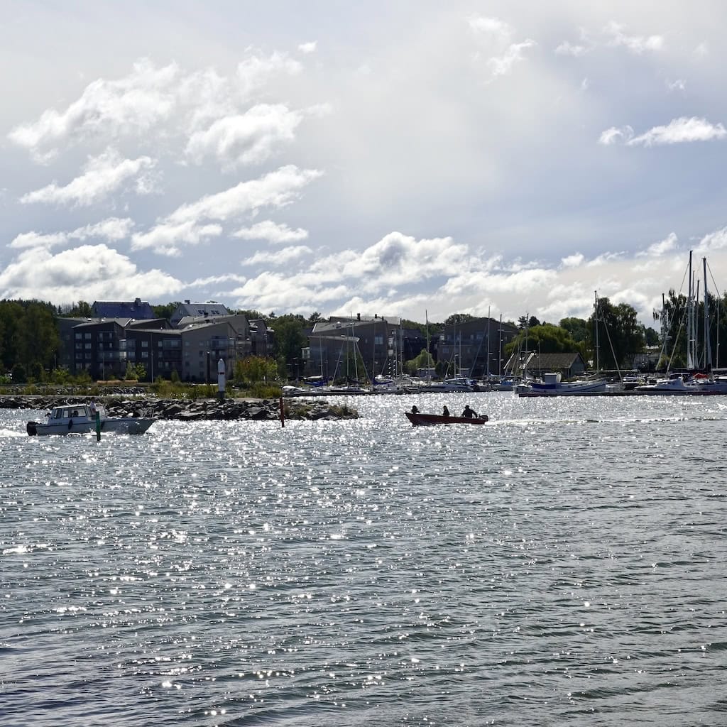 Die Wohnungen am Ufer haben eine schöne Aussicht. Auf den Holzbänken auf der Mole ist es in der Sonne richtig schön warm. Dank sei unseren Faserpelzjacken mit Windstopper. Die kleinen offenen Motorbötchen haben sogar im geschützten Hafenbecken Mühe gegen den Wind anzukommen. Von hier sehen wir in der Ferne unseren Mobi stehen. Auch hier gibt es einige Kolonien der weitverbreiteten Kanadagänse.
