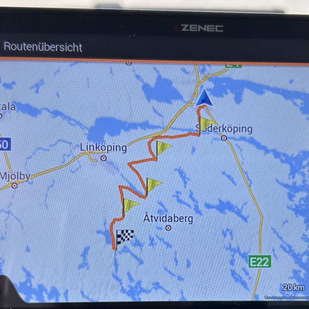 Als Ziel haben wir einen Stellplatz bei Rimaforsa ausgewählt. Unser Navi will uns auf grossen Stassen dorthin führen. Wir aber wollen auf kleinen Strassen querfeldein fahren. Also geben wir viele Wegpunkte ein, was einen wilden Zickzackkurs ergibt.