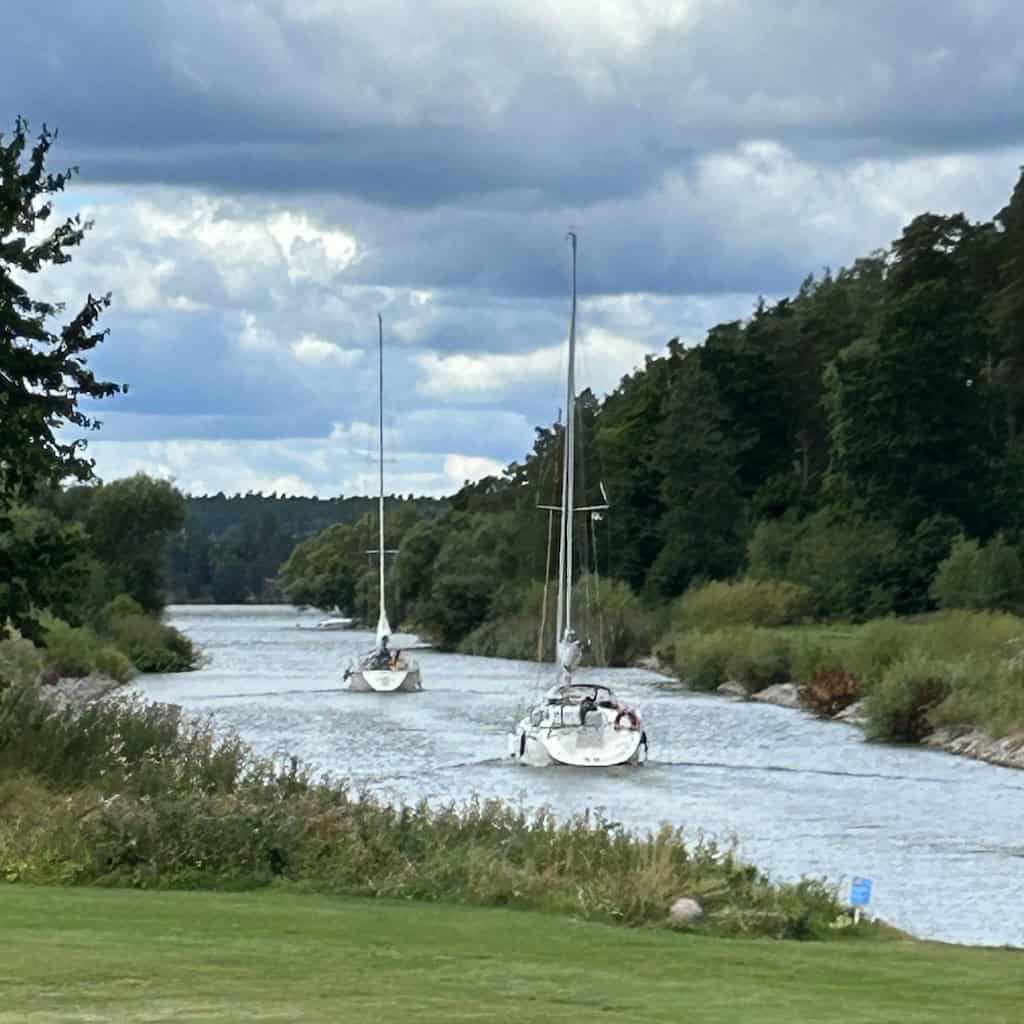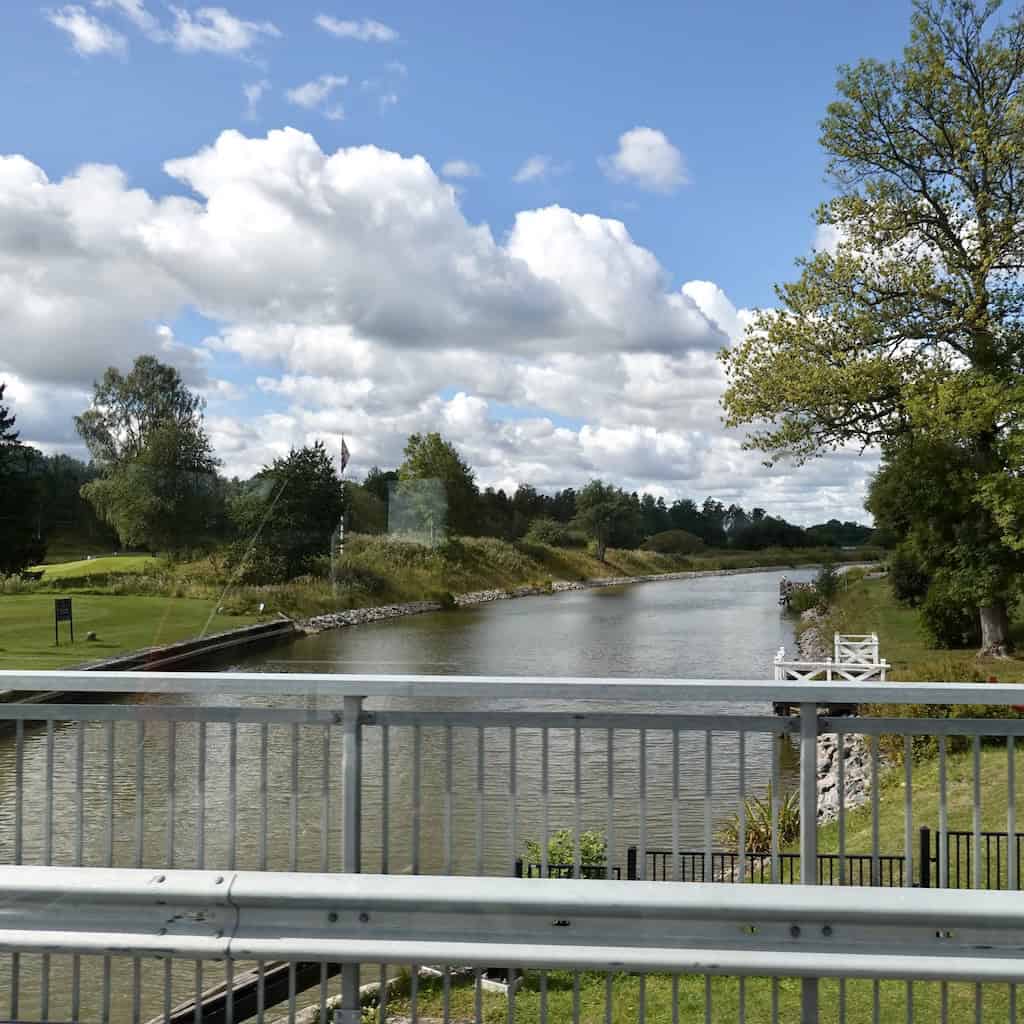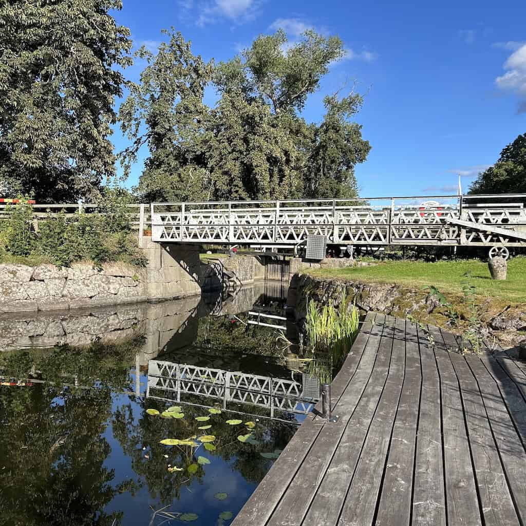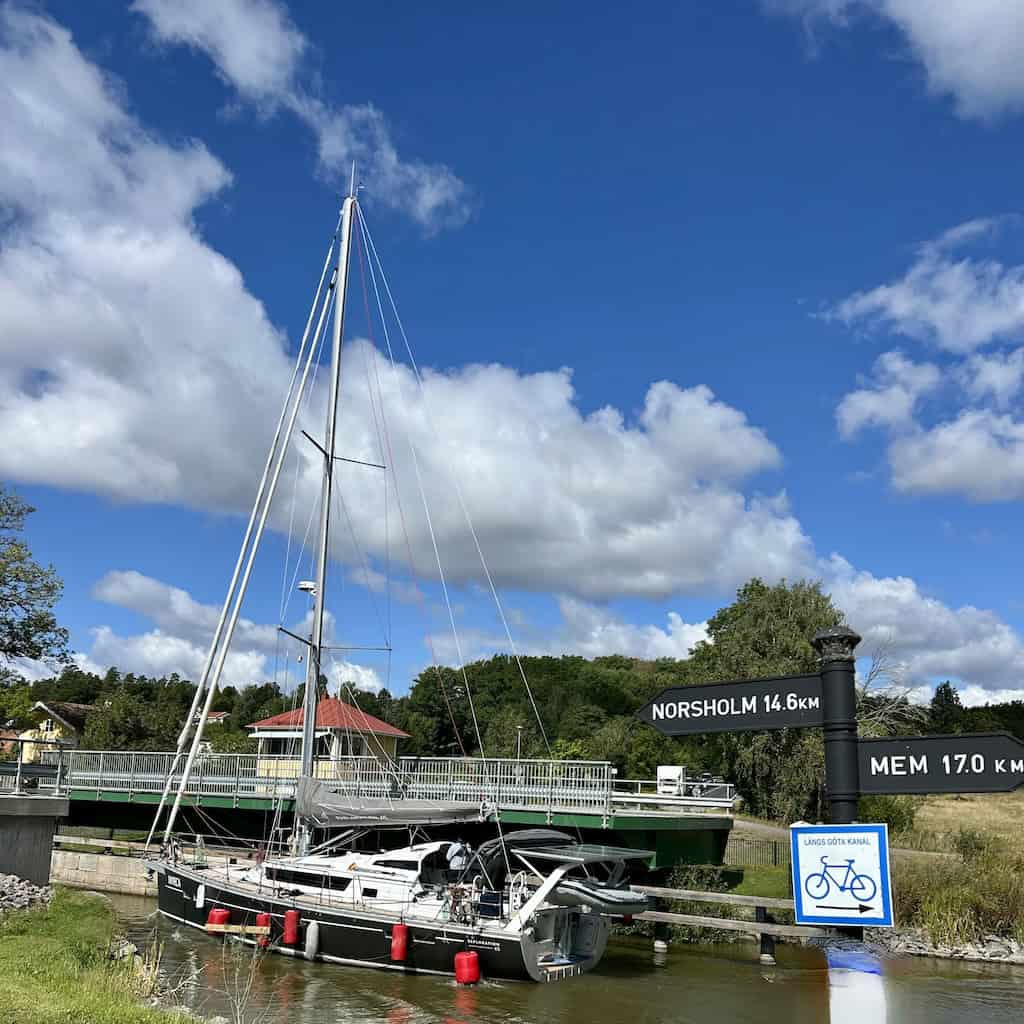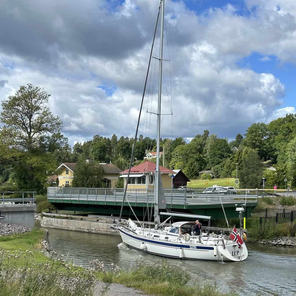 Schon nach kurzer Zeit bimmelt es. Die Schranke für den Strassenverkehr geht zu, die Drehbrücke öffnet sich und eine einzelne Segelyacht kann, ohne die Fahrt zu reduzieren, passieren. Etwa 50 Autos warten in dieser Zeit geduldig. Einige Zeit später kommen noch einmal drei Yachten im Konvoi vorbei. Sie alle kommen aus Richtung Mem, 170 Kilometer entfernt, wo der Götakanal beginnt.