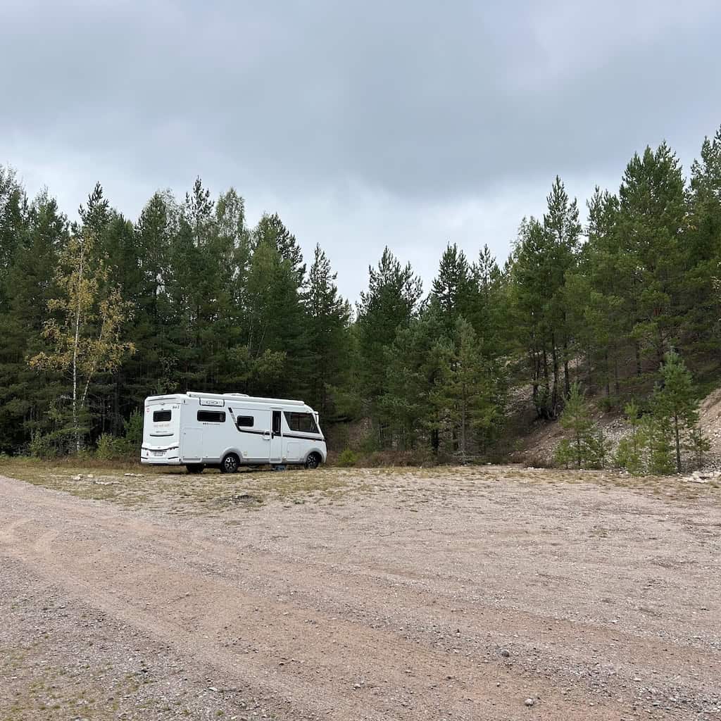 So fahren wir einen Kilometer am See entlang. Dort ist am Ende eine kleine Lichtung. Auch hier stehen wir wunderbar und haben den See vor uns. Spiegelglatt liegt er vor uns und in der Ferne ist der Steg zu sehen, wo wir gestern standen.