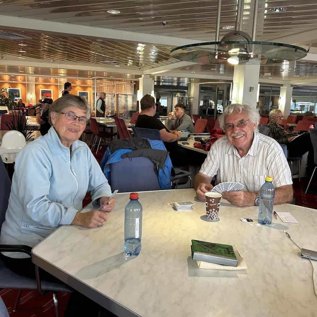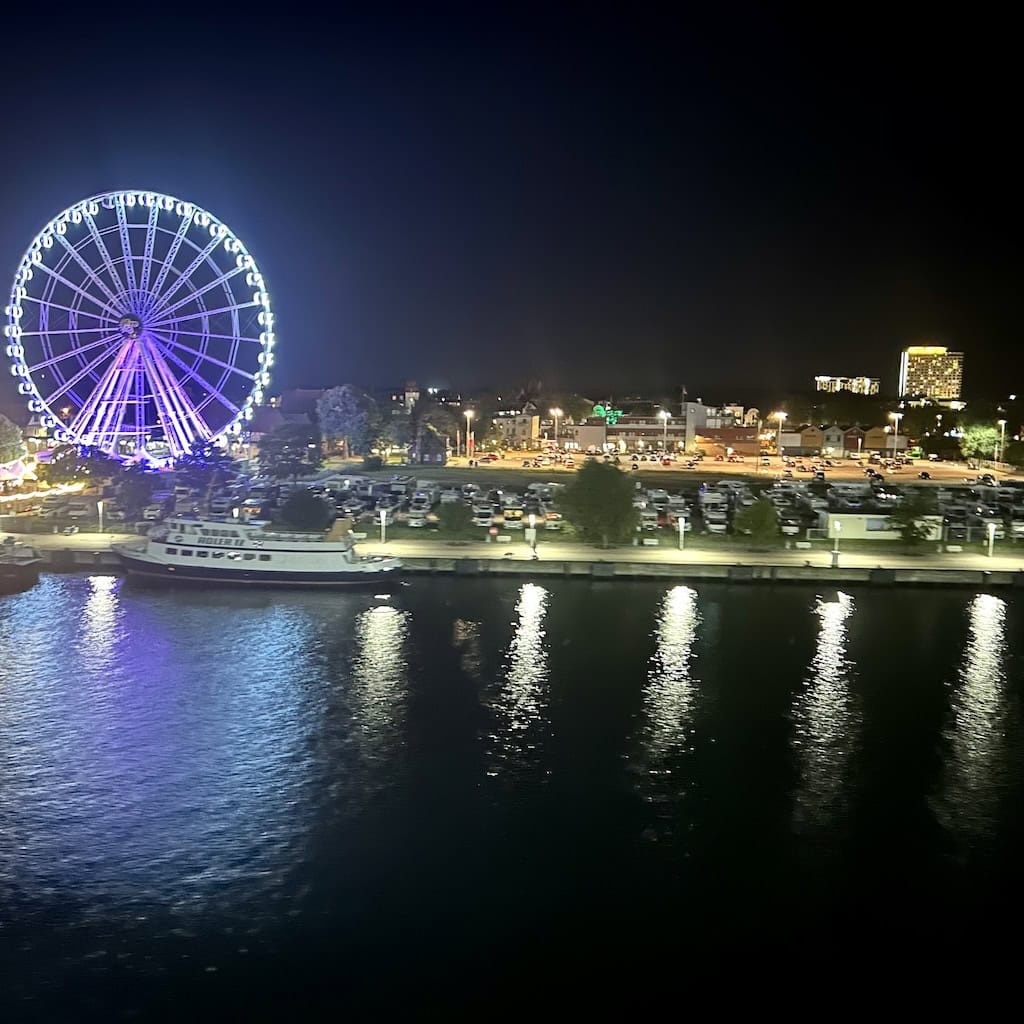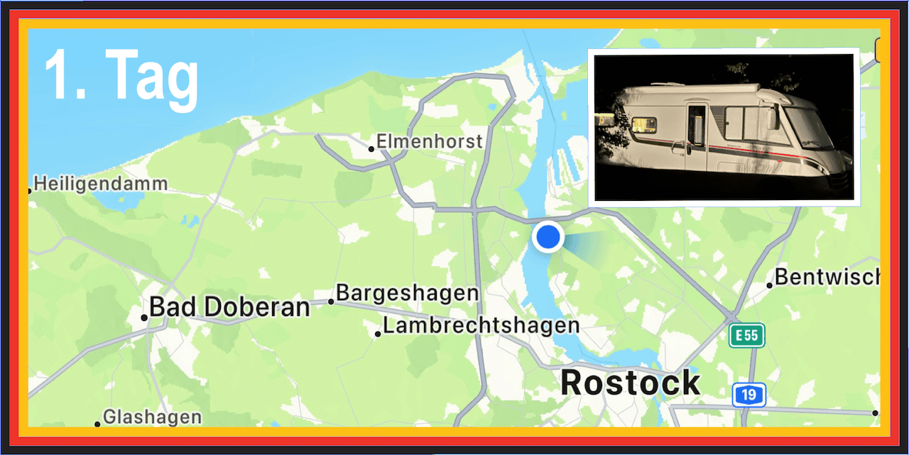 Wir essen recht gut und auch preiswert das Tagesmenue für € 16.50 und vertreiben uns die Zeit mit Kartenspielen und auch Surfen im Internet. Das WLAN ist auf diesem Schiff der TT-Line übrigens viel besser als wir das von Stena-Line kennen. Bei denen hat man 15 Minuten schnelles Netz, dann nur noch auf Sparflamme. Bei TT-Line konnte man die ganze Überfahrt streamen so viel man wollte. Die Fähre erreicht Rostock/Warnemünde rechtzeitig um 22 Uhr. Auf der Mittelmole ist offenbar Kirmes. Wir erleben beim Verlassen der Fähre auch noch etwas Kirmes. Vor uns wird eine Schranke geschlossen. Dann senkt sich die Rampe, die wir hinaufgefahren sind plötzlich nach unten. Ein komisches Gefühl auf der schiefen Bahn, wenn vor einem nur ein tiefes Loch erscheint.
