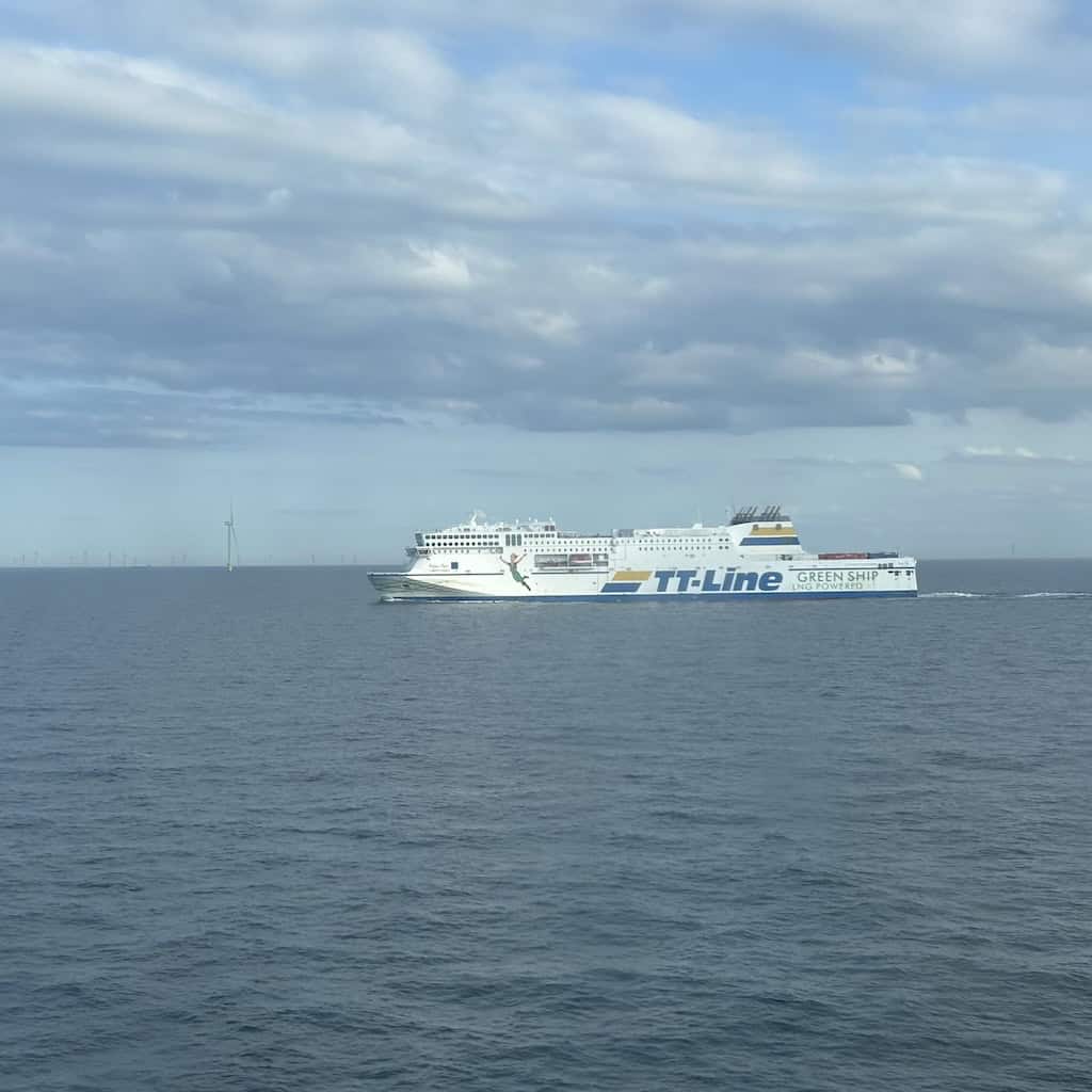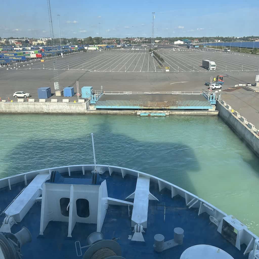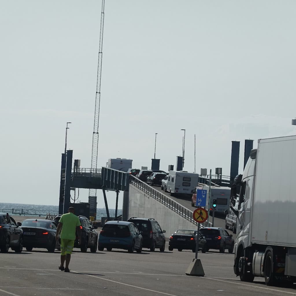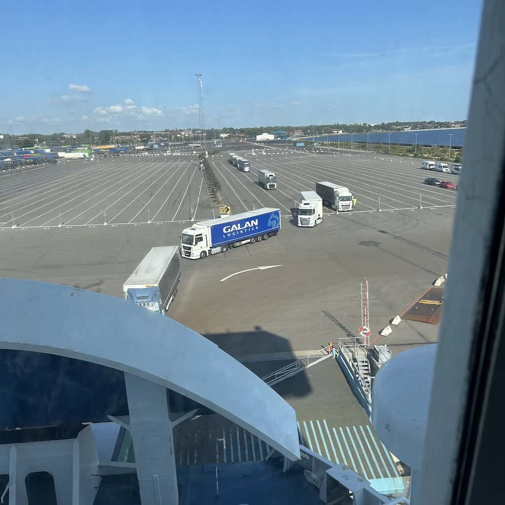 Gegen 15 Uhr sind wir beim Hafengelände. Das ist riesig. Vom ersten Kontrollpunkt bis zur zugewiesenen Spur J beim Terminal fahren wir etwa 10 Minuten kreuz und quer. Es kommt uns viel länger vor als letztes Jahr, als wir mit der Stena-Line fuhren. Vielleicht legt die TT-Line an einem anderen Dock ab. Vielleicht haben wir es aber nur vergessen.
