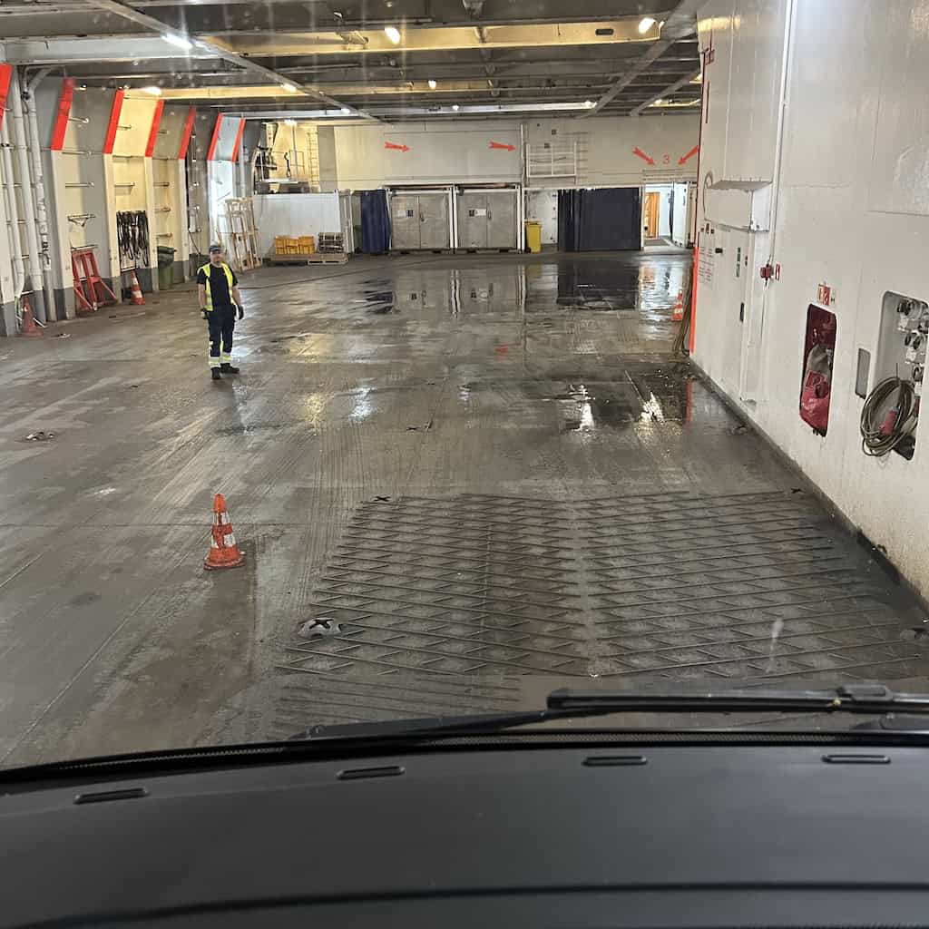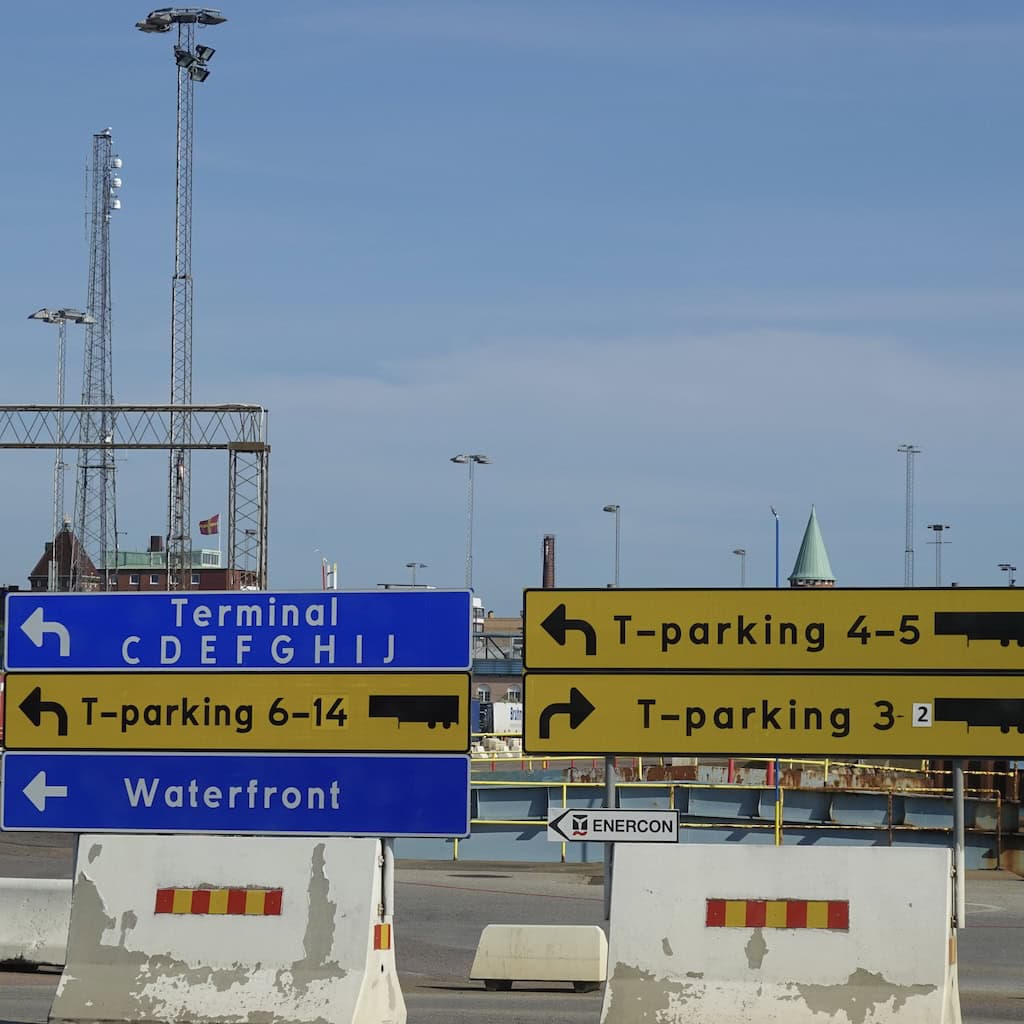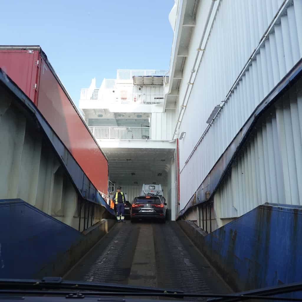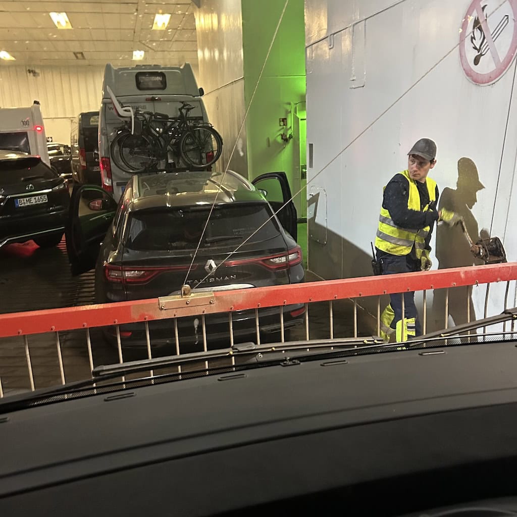 Gegen 15 Uhr sind wir beim Hafengelände. Das ist riesig. Vom ersten Kontrollpunkt bis zur zugewiesenen Spur J beim Terminal fahren wir etwa 10 Minuten kreuz und quer. Es kommt uns viel länger vor als letztes Jahr, als wir mit der Stena-Line fuhren. Vielleicht legt die TT-Line an einem anderen Dock ab. Vielleicht haben wir es aber nur vergessen.