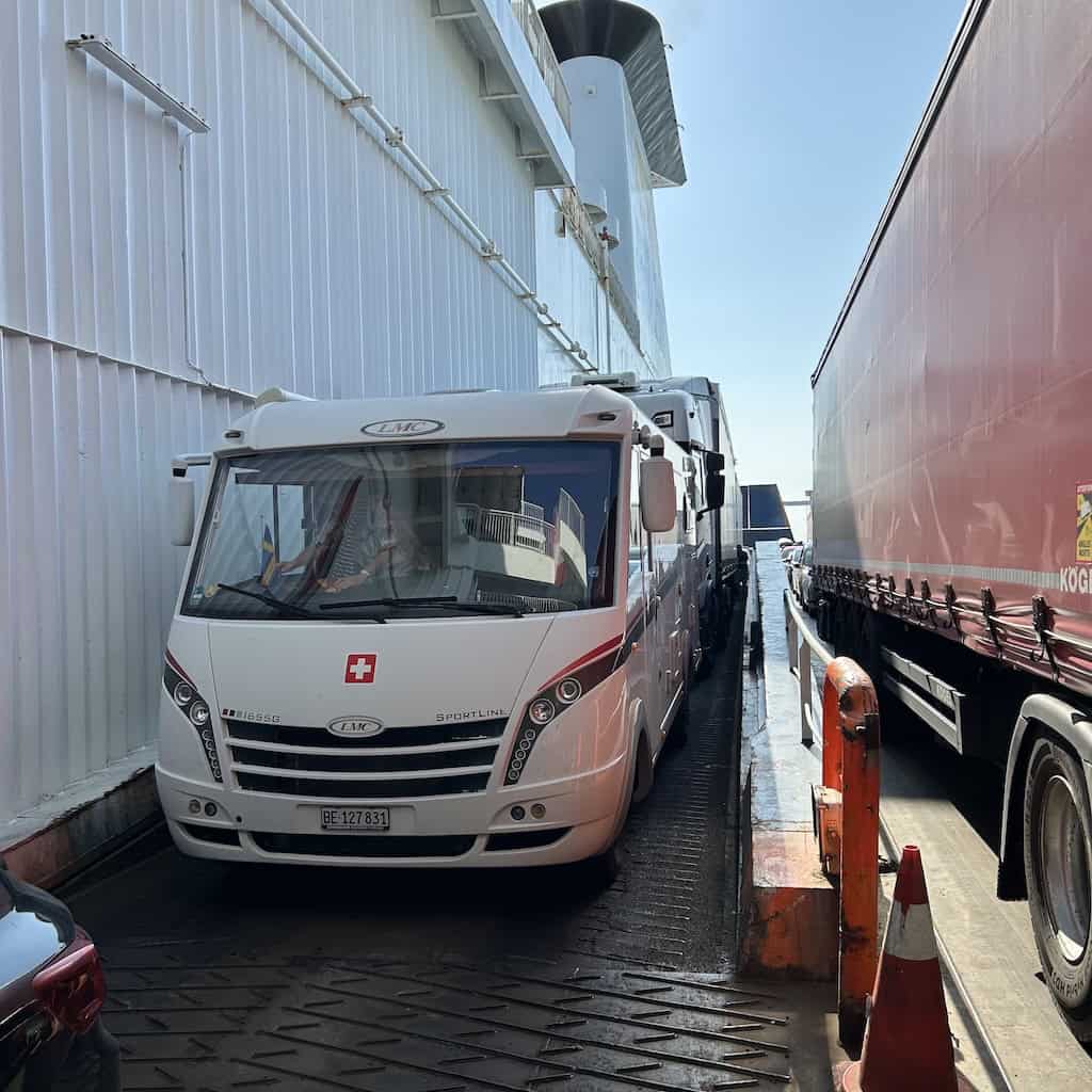 Unsere Spur darf auch bald auf die Fähre fahren. Auf einer steilen Rampe zum Deck 5 lässt man uns anhalten. Ob unser Mobi etwa die ganze Überfahrt so schräg stehen bleiben soll? Das würde unserem Absorber-Kühlschrank Mühe bereiten. Erstmals hat man uns nicht aufgefordert, das Gas abzustellen. Ob dies nur bei Stena-Line praktiziert wird? In Unkenntnis haben wir unser Tiefkühlfach leer gemacht.