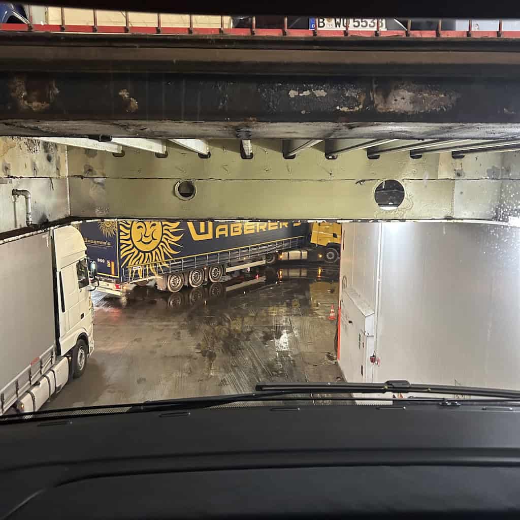 Aber bis wir bereit sind um unseren Mobi zu verlassen, wurde die Rampe bereits angehoben und wir stehen wieder eben. Wir sitzen schon im Restaurant, als immer noch LKWs auffahren.