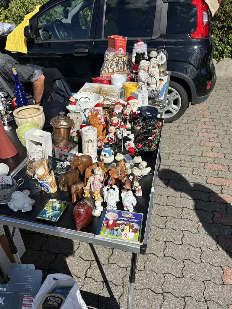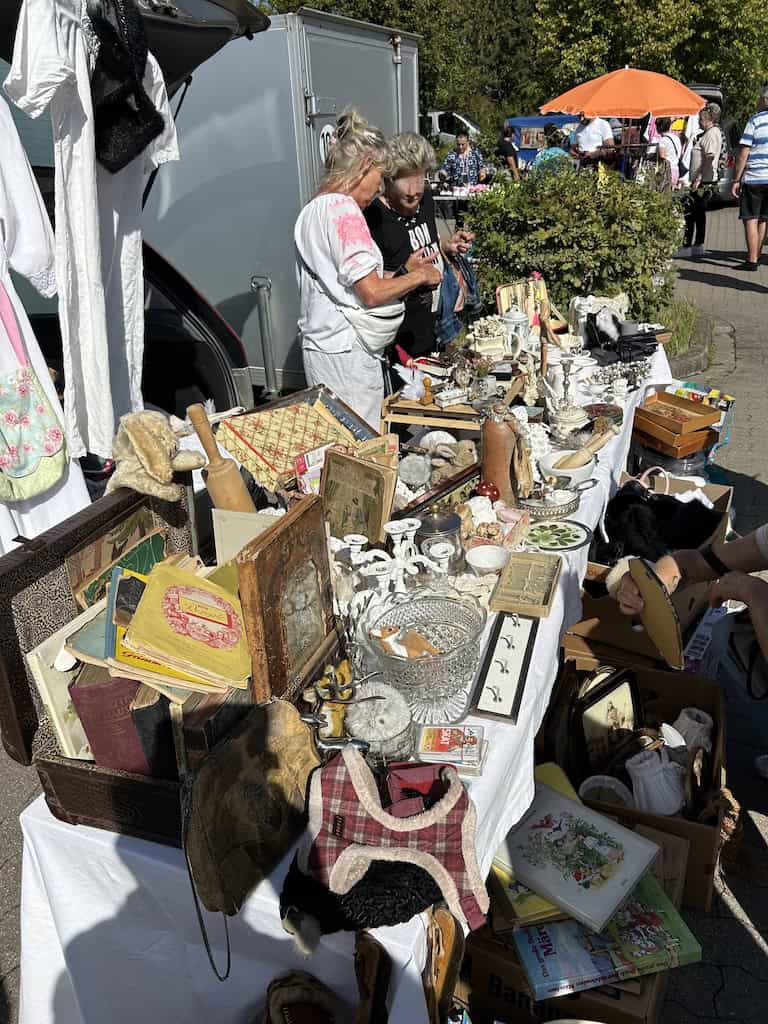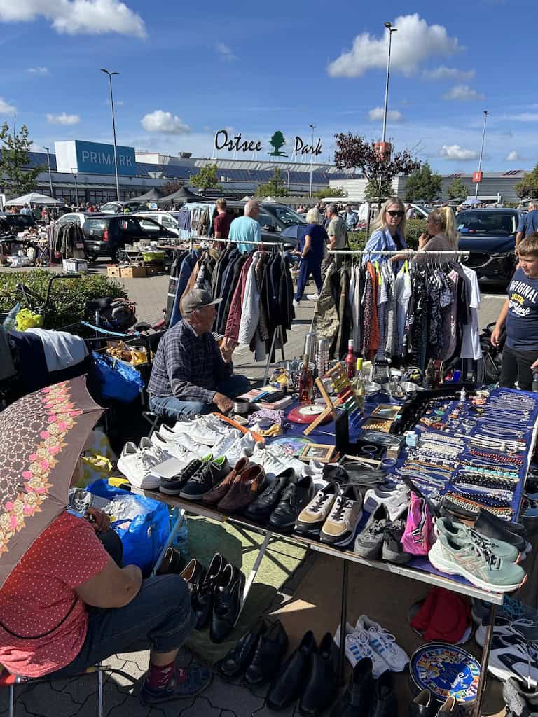 Nachdem wir den Stellplatz verlassen haben, fallen uns nach einem Kilometer Fahrt beim Ostsee Park grosse Auto- und Menschenmassen auf. Auf zwei riesigen Parkplätzen ist hier ein Trödlermarkt im Gange. Es sind viele Besucher, die allermeisten aber wohl nur Schaulustige, wie auch wir. Es ist ja auch spannend, was so alles feilgeboten wird. Und auch die Menschen zu beobachten ist interessant, ob jetzt das spezielle Völkchen der Anbieter oder auch die Typen von Besuchern.