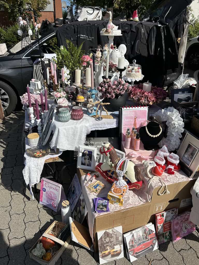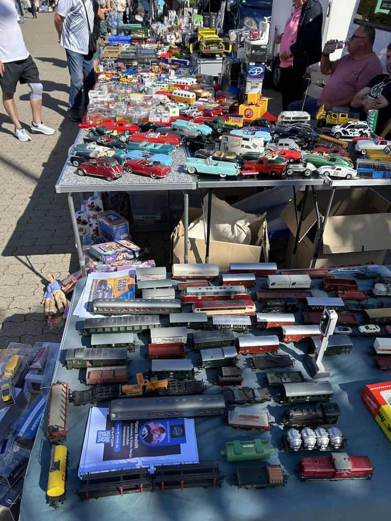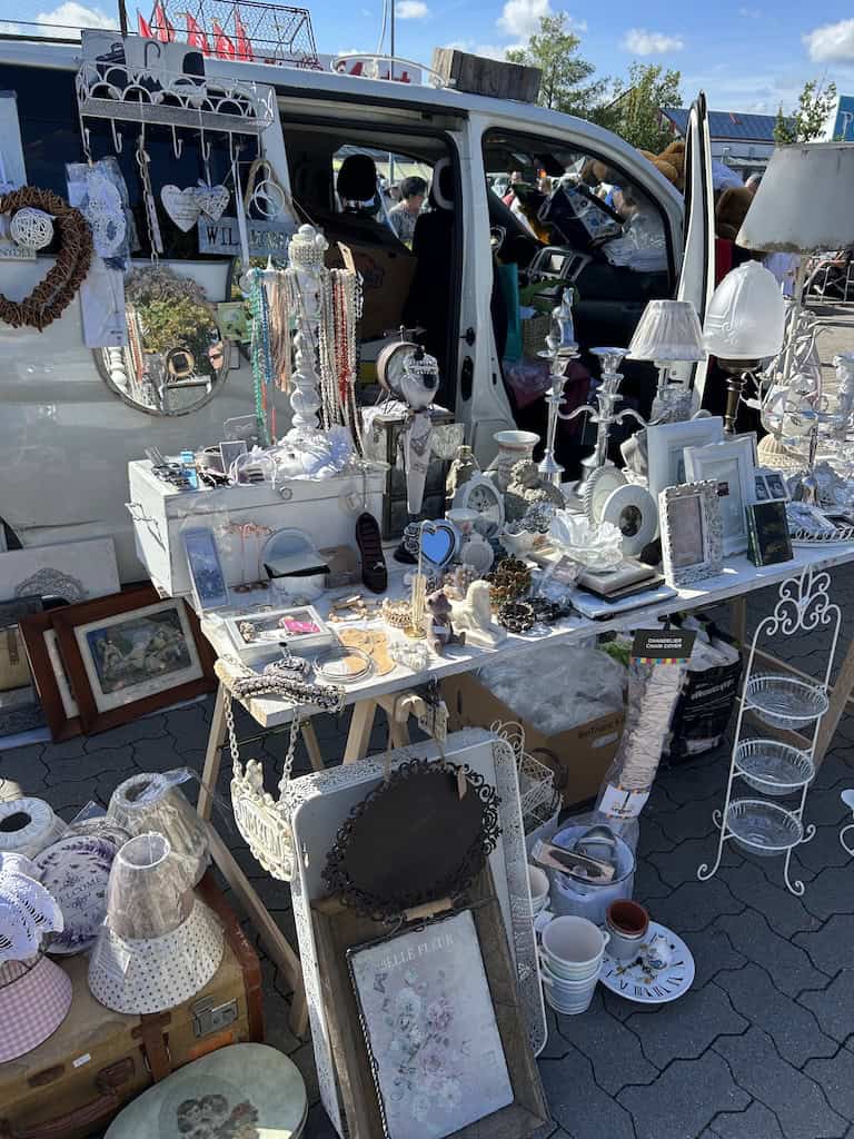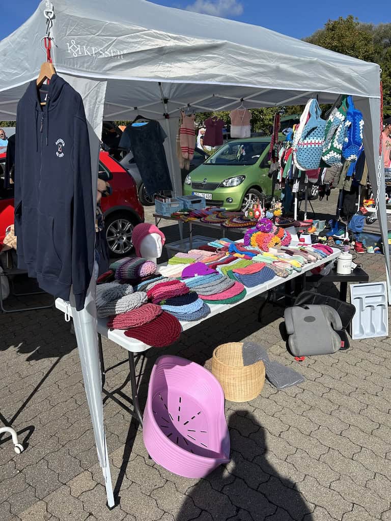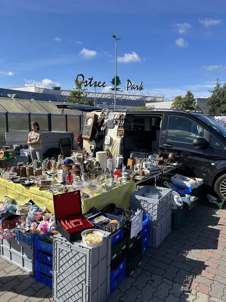 Nachdem wir den Stellplatz verlassen haben, fallen uns nach einem Kilometer Fahrt beim Ostsee Park grosse Auto- und Menschenmassen auf. Auf zwei riesigen Parkplätzen ist hier ein Trödlermarkt im Gange. Es sind viele Besucher, die allermeisten aber wohl nur Schaulustige, wie auch wir. Es ist ja auch spannend, was so alles feilgeboten wird. Und auch die Menschen zu beobachten ist interessant, ob jetzt das spezielle Völkchen der Anbieter oder auch die Typen von Besuchern.